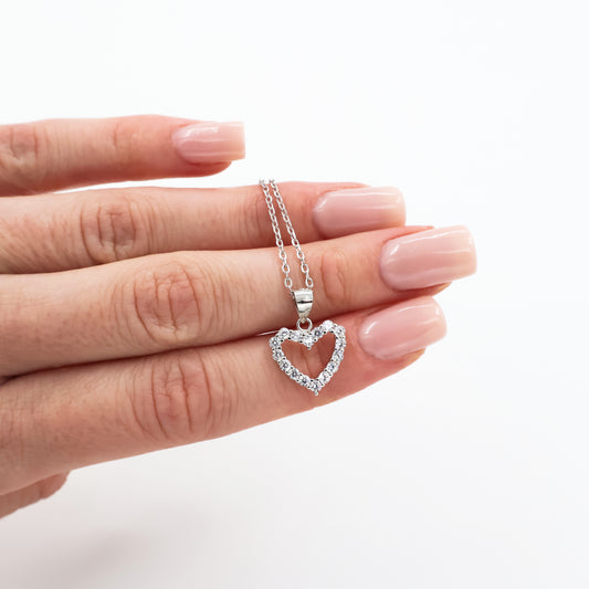 Rhodium Plated 925 Sterling Silver Heart Pendant Necklace with White Zirconia