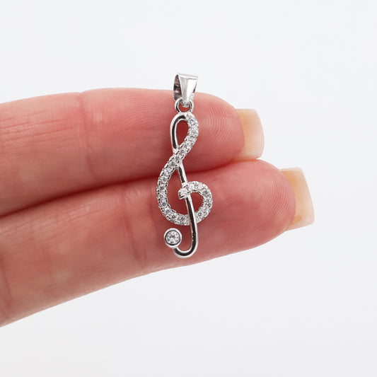 925 Sterling Silver Rhodium Plated Treble Clef Necklace with White Zirconia