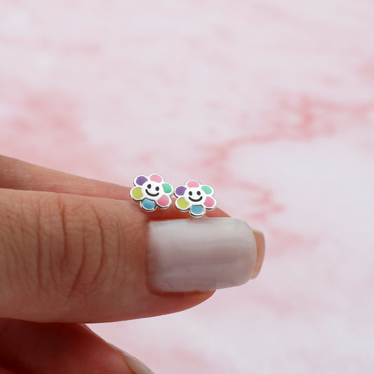 Pendientes de botón con flor sonriente y pétalos multicolor
