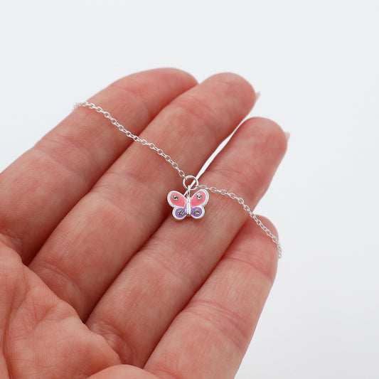 Necklace featuring a pink and purple butterfly with 4 white crystals