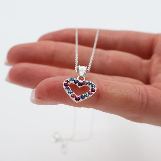Sterling Silver 925 Heart Pendant Necklace with 16 Colorful Zirconia