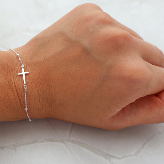 Pulsera con cuentas de plata y colgante de cruz fija