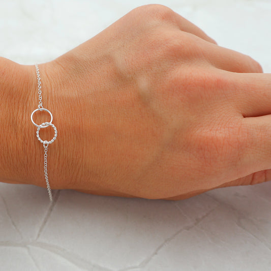 Pulsera con colgantes de círculos entrelazados, uno sencillo y otro trenzado