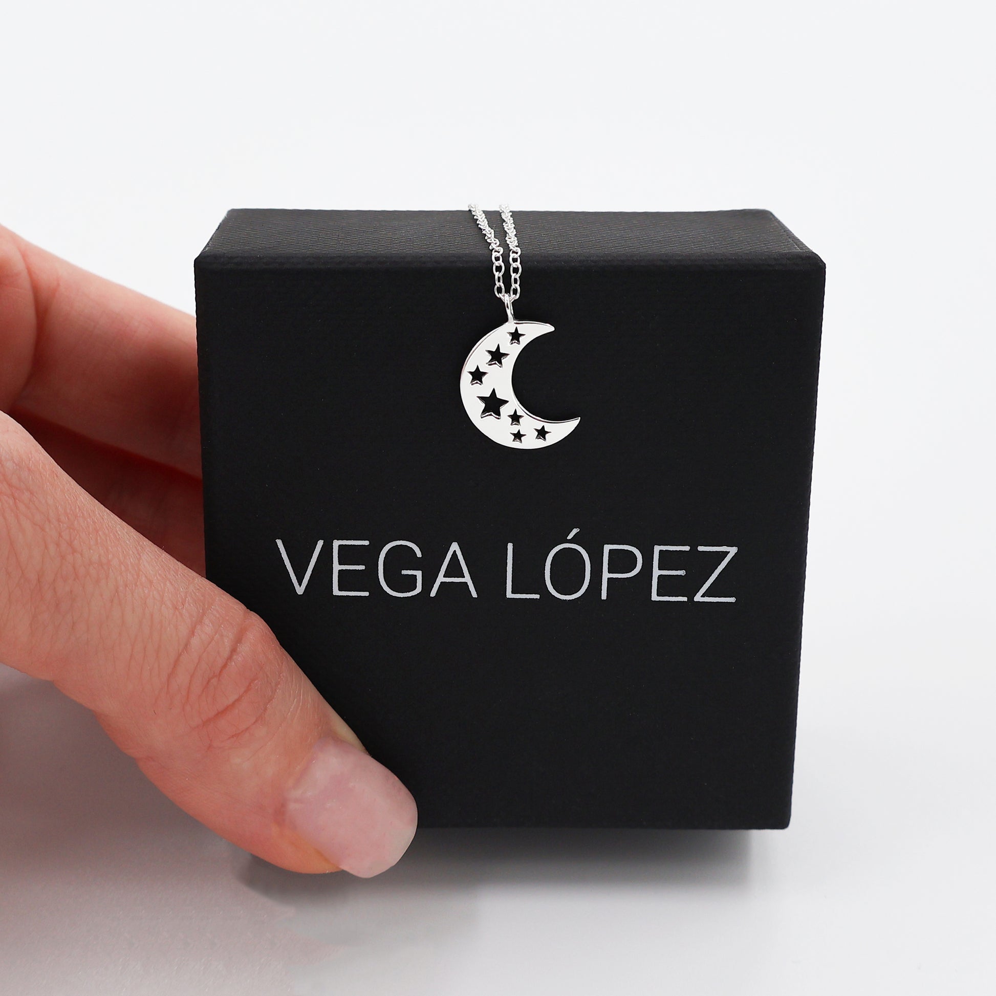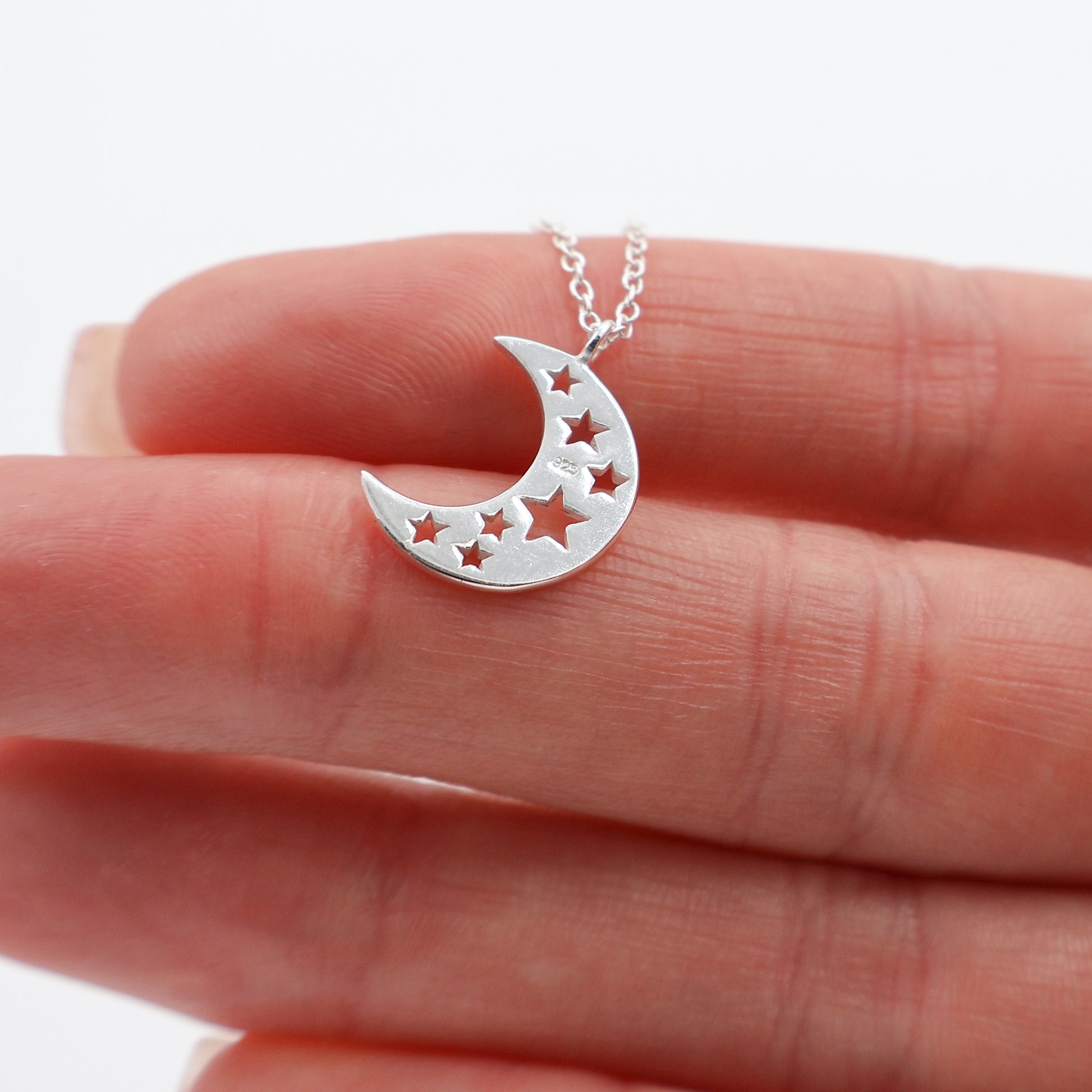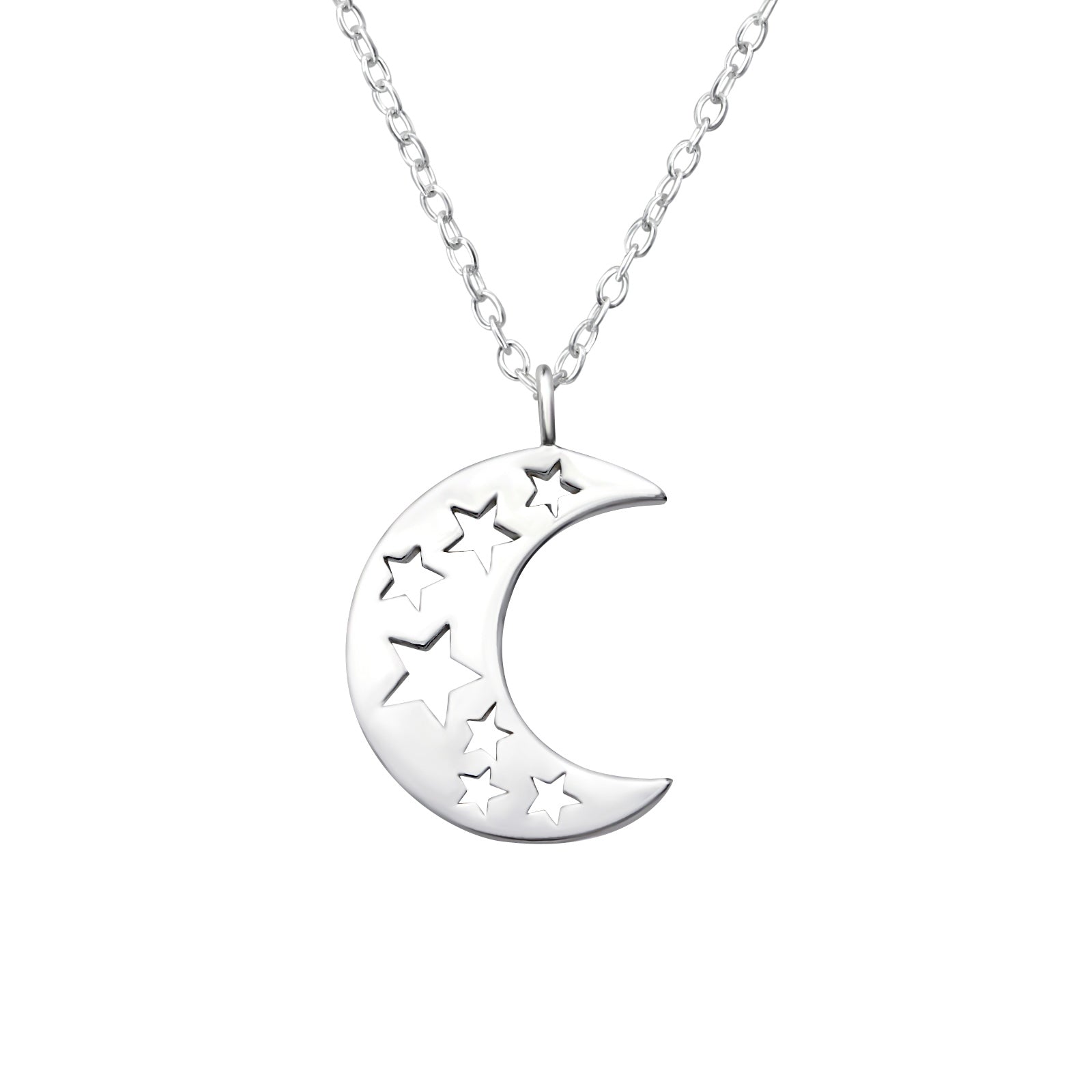 This exquisite necklace, crafted from 925 sterling silver, captures the beauty of the night sky with its enchanting crescent moon pendant. Delicately adorned with intricately cut-out stars, the pendant symbolizes dreams, guidance, and infinite possibilities. Its timeless design exudes a subtle charm, perfect for those who seek a meaningful and elegant accessory.