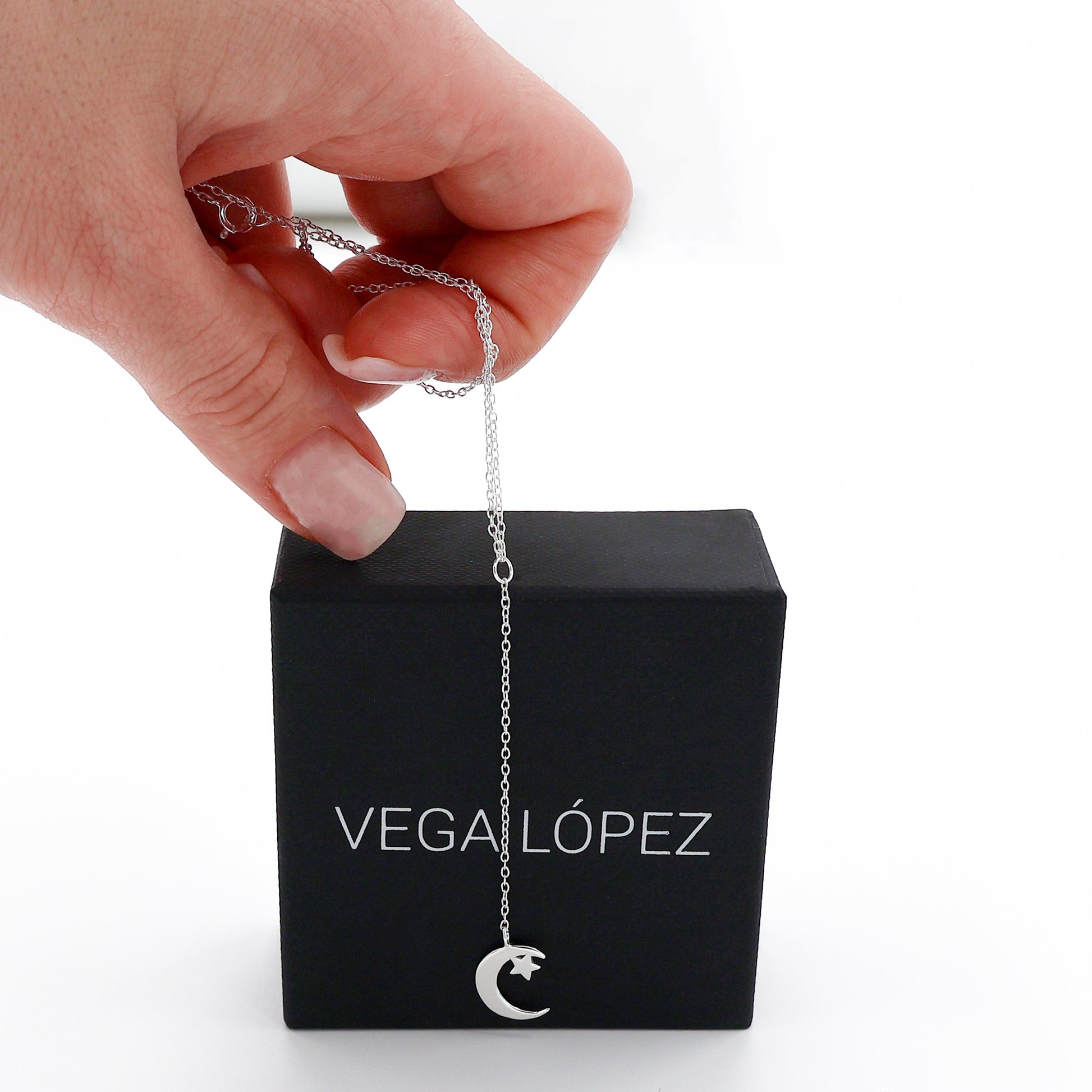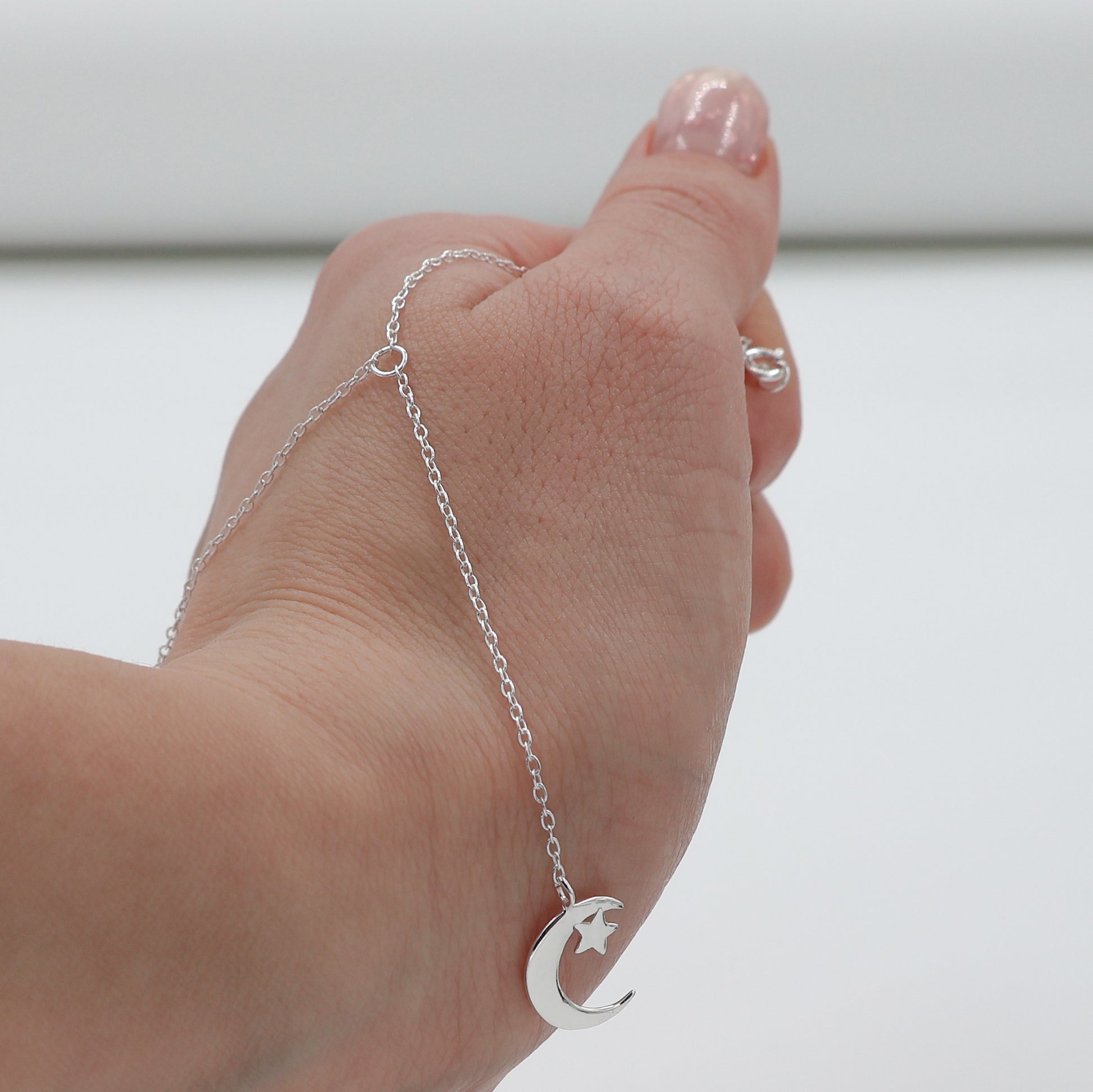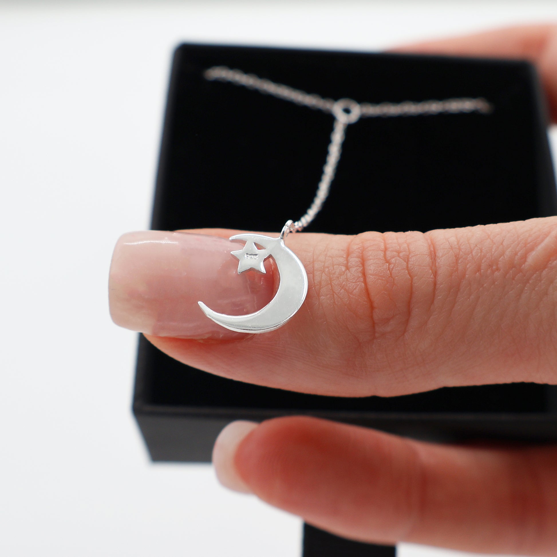 The necklace features a 5 cm extension chain, offering versatility to complement various styles and preferences. At its center, a large crescent moon pendant gracefully dangles, adorned with a small star at its peak, adding a celestial charm to the piece.