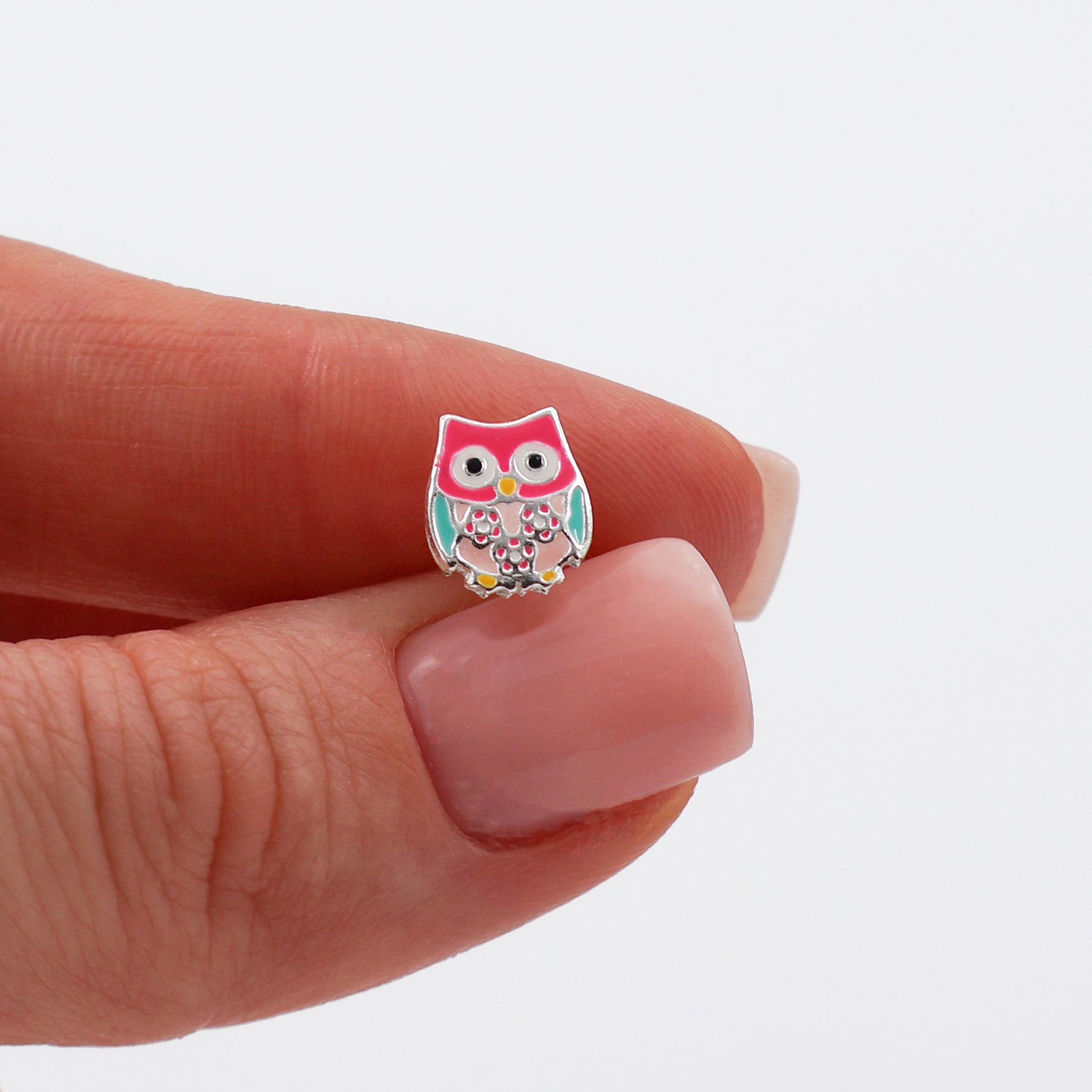 These owl-shaped stud earrings made of 925 sterling silver combine playful design with durability and functionality. Inspired by the charming symbol of wisdom, the owl, they are adorned with colorful details in shades of pink, blue, and yellow, adding a vibrant and captivating touch.