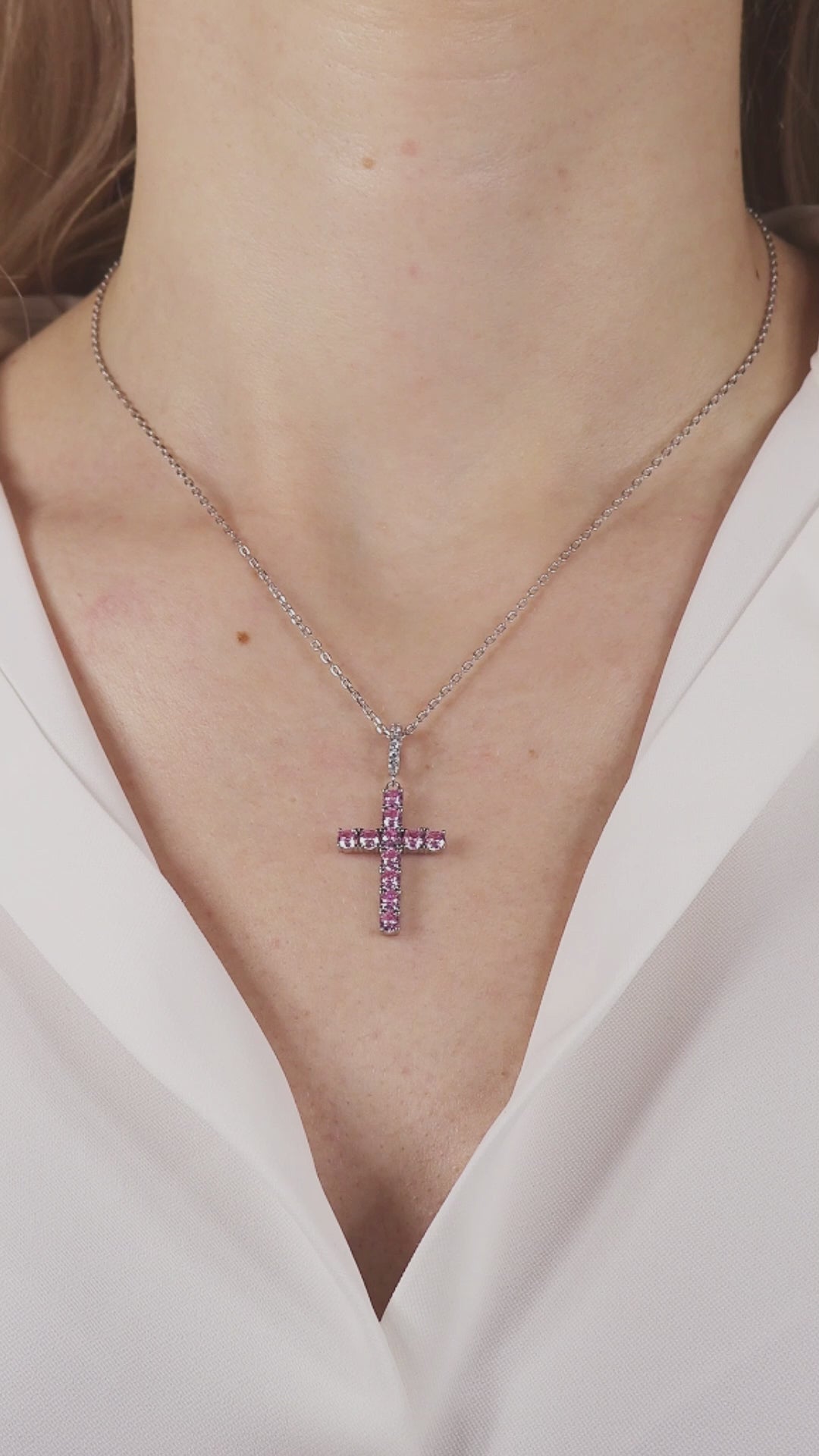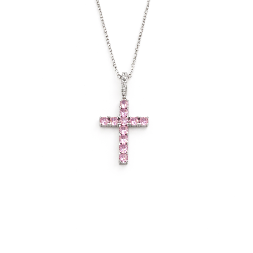 Set on a delicate ankier weave chain, the necklace is adorned with a beautifully shaped cross pendant, embellished with white and pink rhinestones that add a soft, luminous sparkle and a subtle contrast of color.