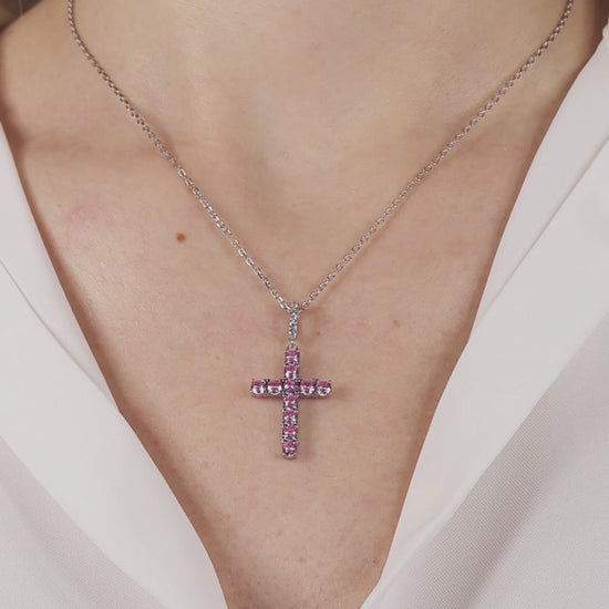 925 Sterling Silver Rhodium Plated Cross Necklace with White and Pink Rhinestones