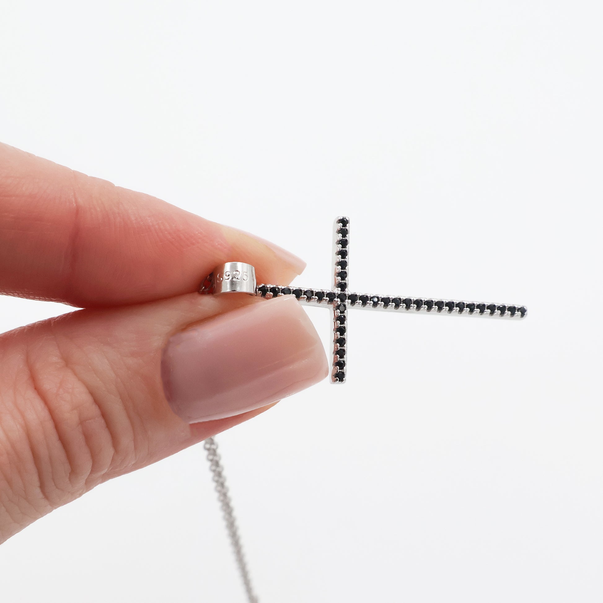 The centerpiece of the necklace is a beautifully shaped cross pendant, adorned with black zirconia stones that create a striking contrast and a subtle, luxurious sparkle. The dark tones of the zirconia enhance the pendant’s modern and elegant character, making it a distinctive statement piece.