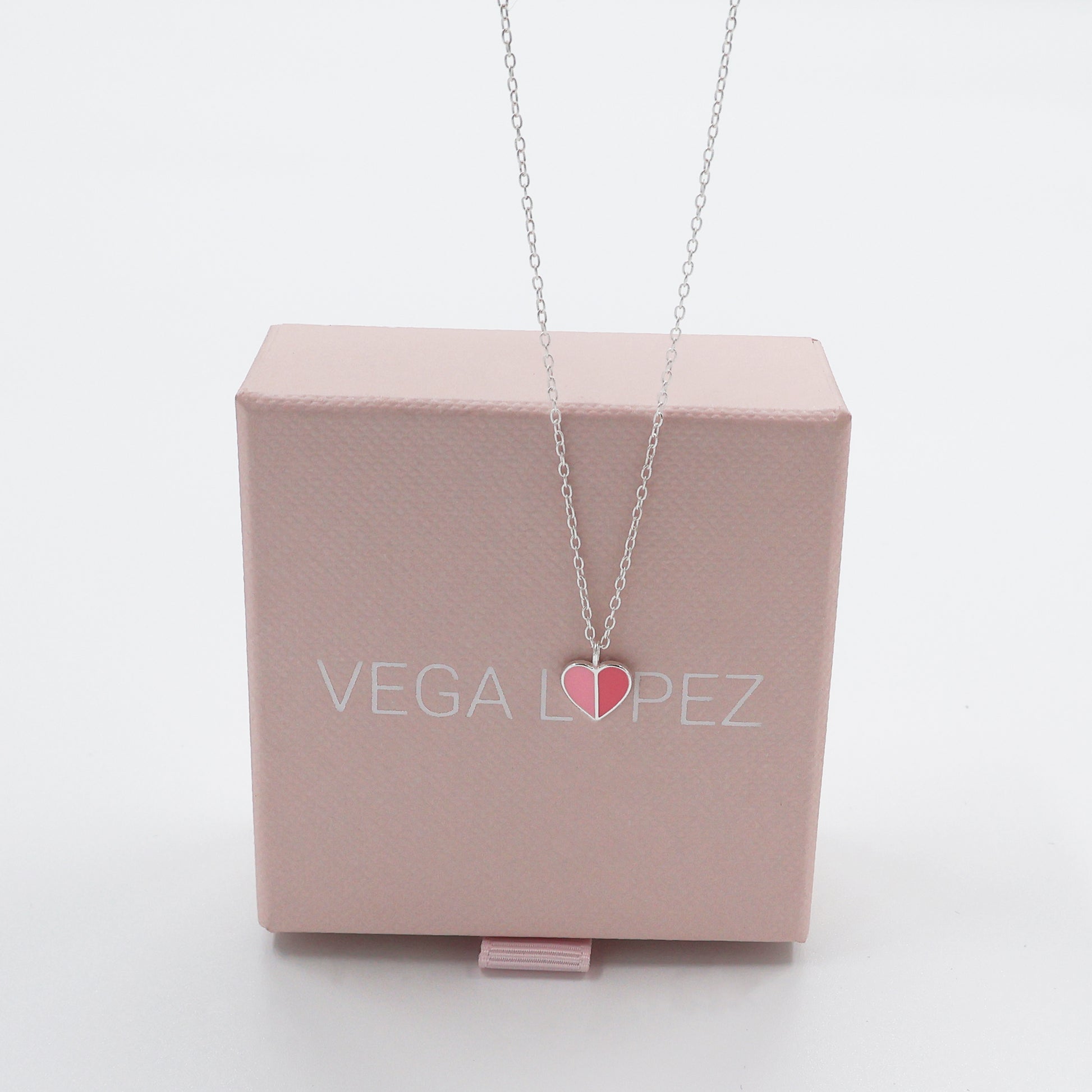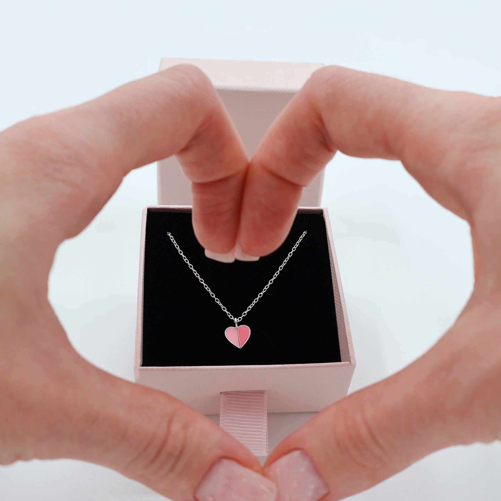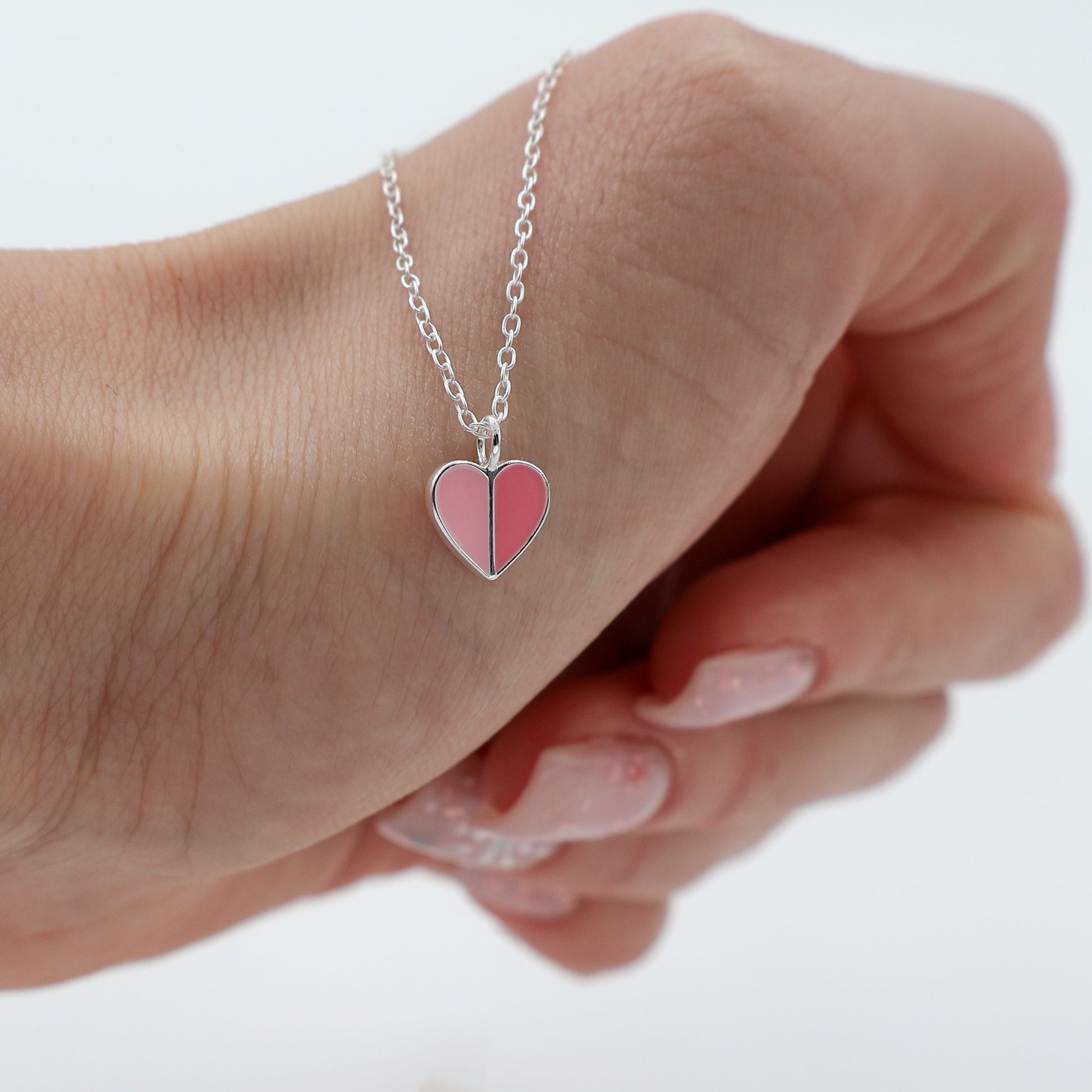 This exquisite silver necklace is beautifully crafted from 925 sterling silver, featuring a unique pendant in the shape of a heart split into two halves. The design is brought to life with two complementary shades of pink—one soft and light, the other vibrant and bold—creating a harmonious balance of color and emotion.