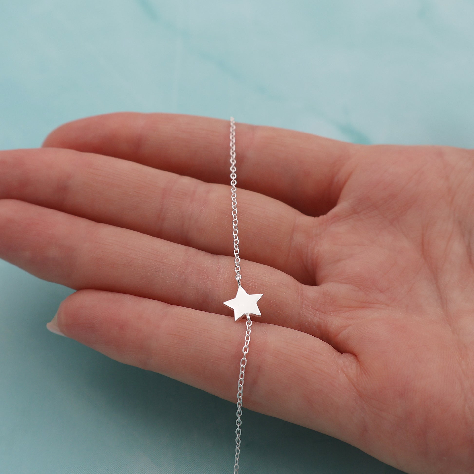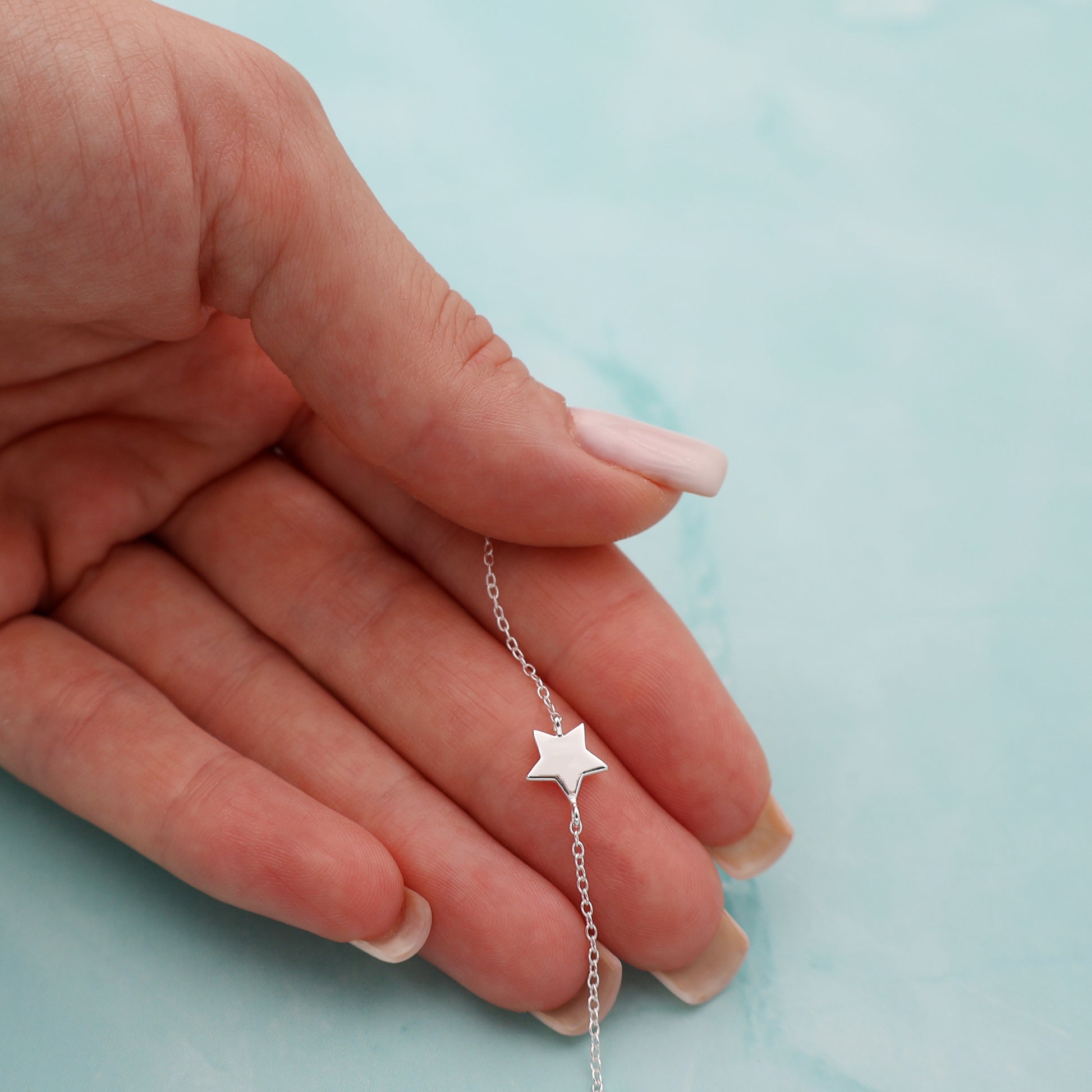 Esta pulsera ajustable, elaborada en plata de ley 925, presenta un delicado colgante en forma de estrella, unido en ambos extremos a la cadena de la pulsera.