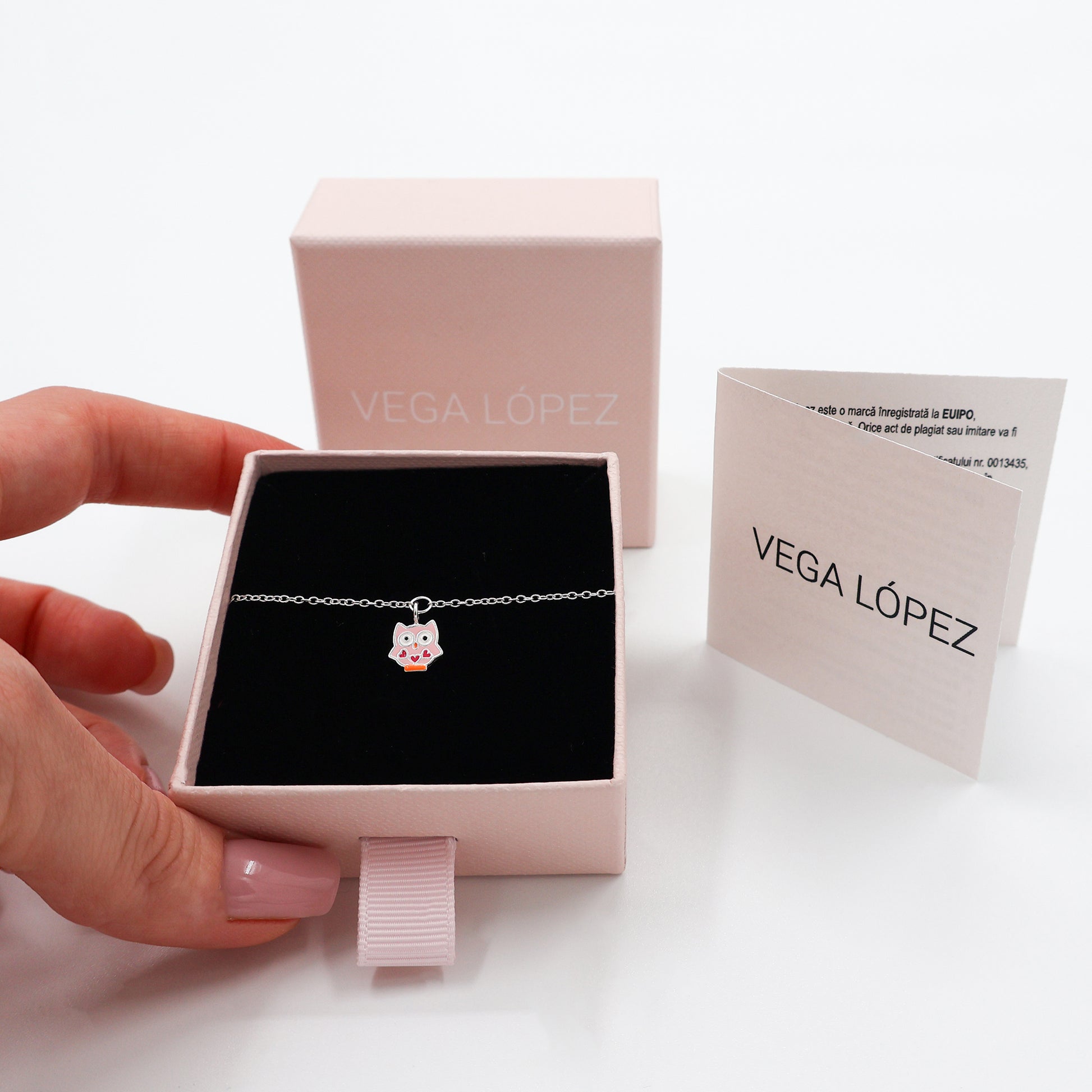 Una pulsera con un colgante de búho rosa adornado con tres corazones, elaborada en plata 925.