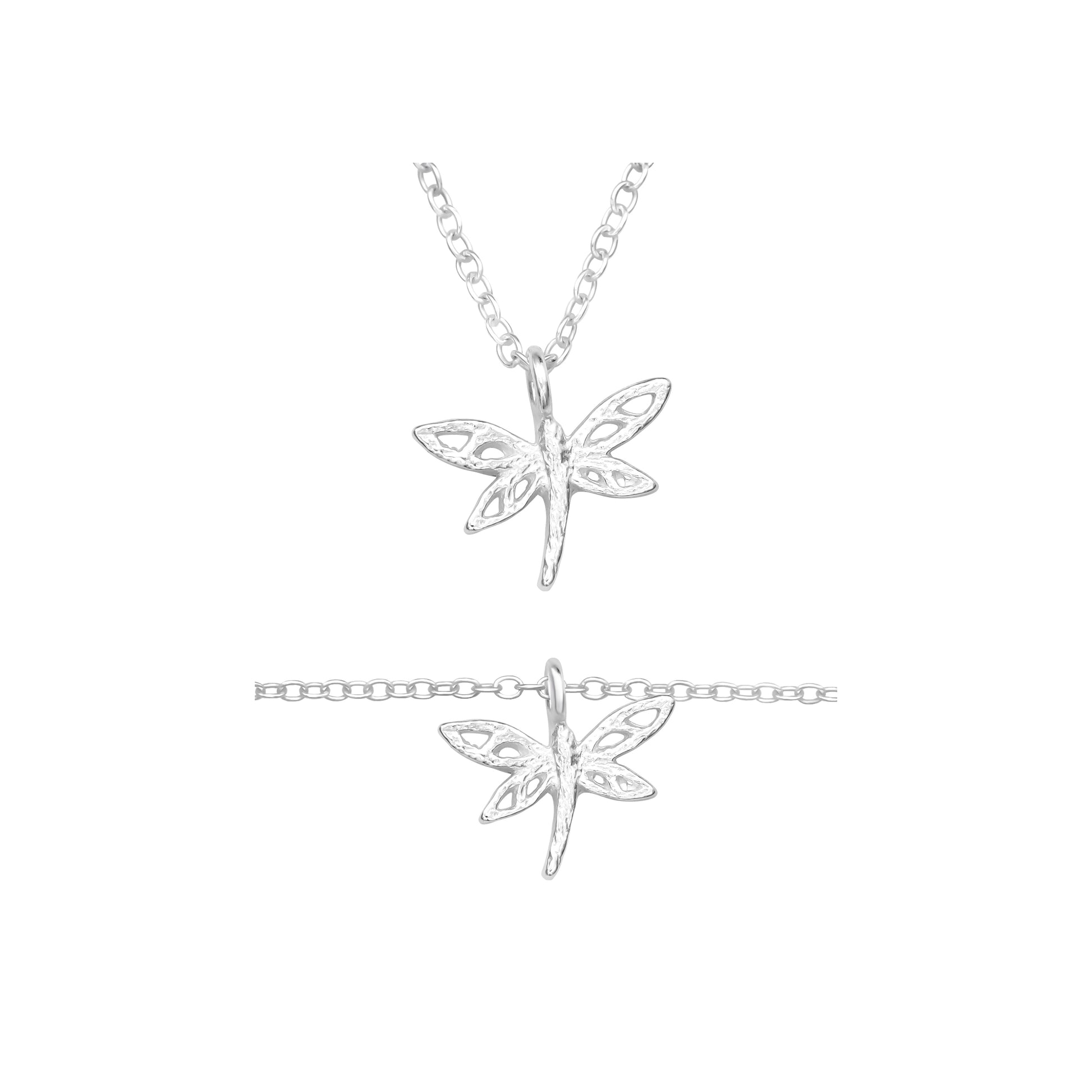 This refined jewelry set, consisting of a bracelet and a necklace, is crafted from 925 sterling silver and adorned with dragonfly-shaped pendants.