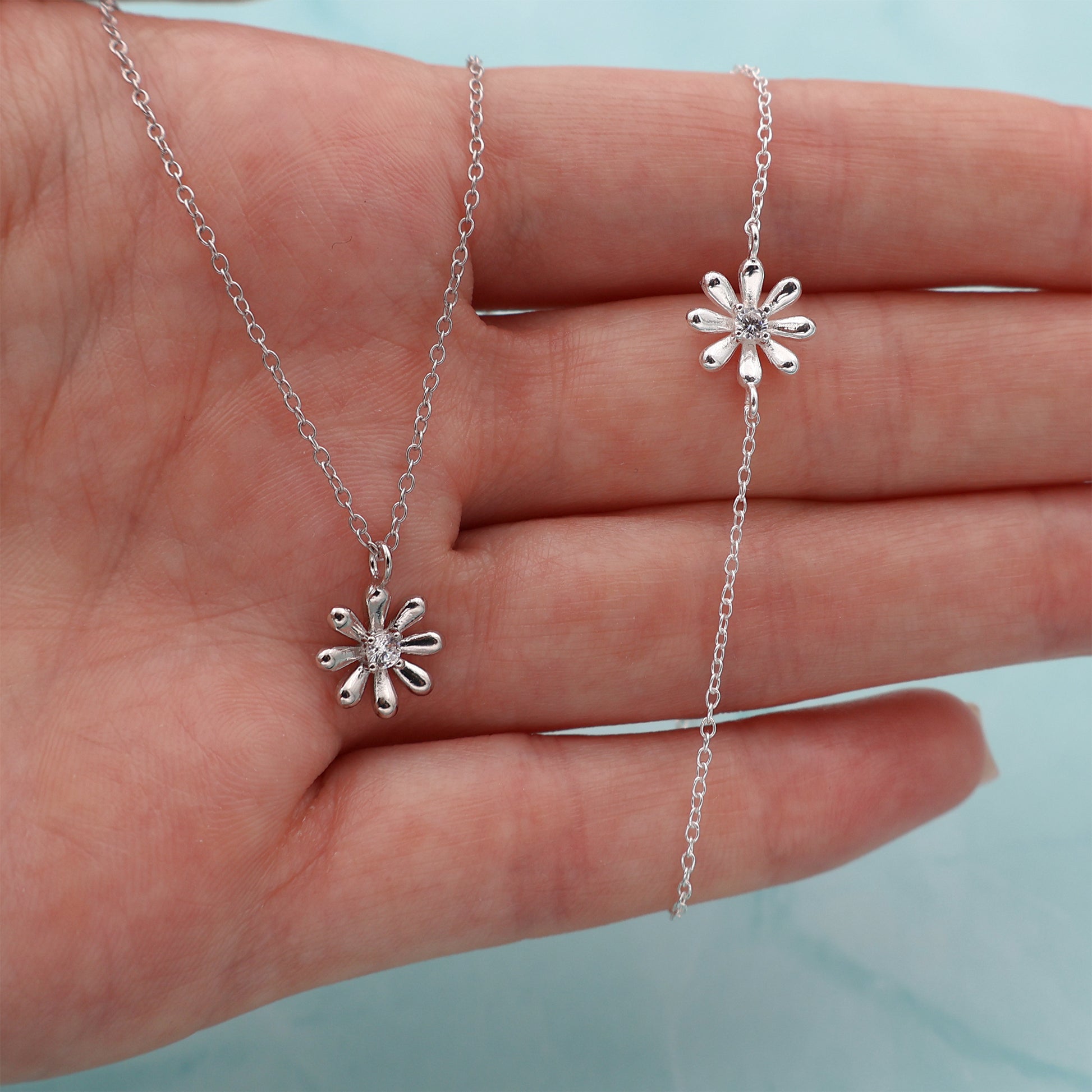 Flower Pendant Necklace & Bracelet Set with Central Zirconia