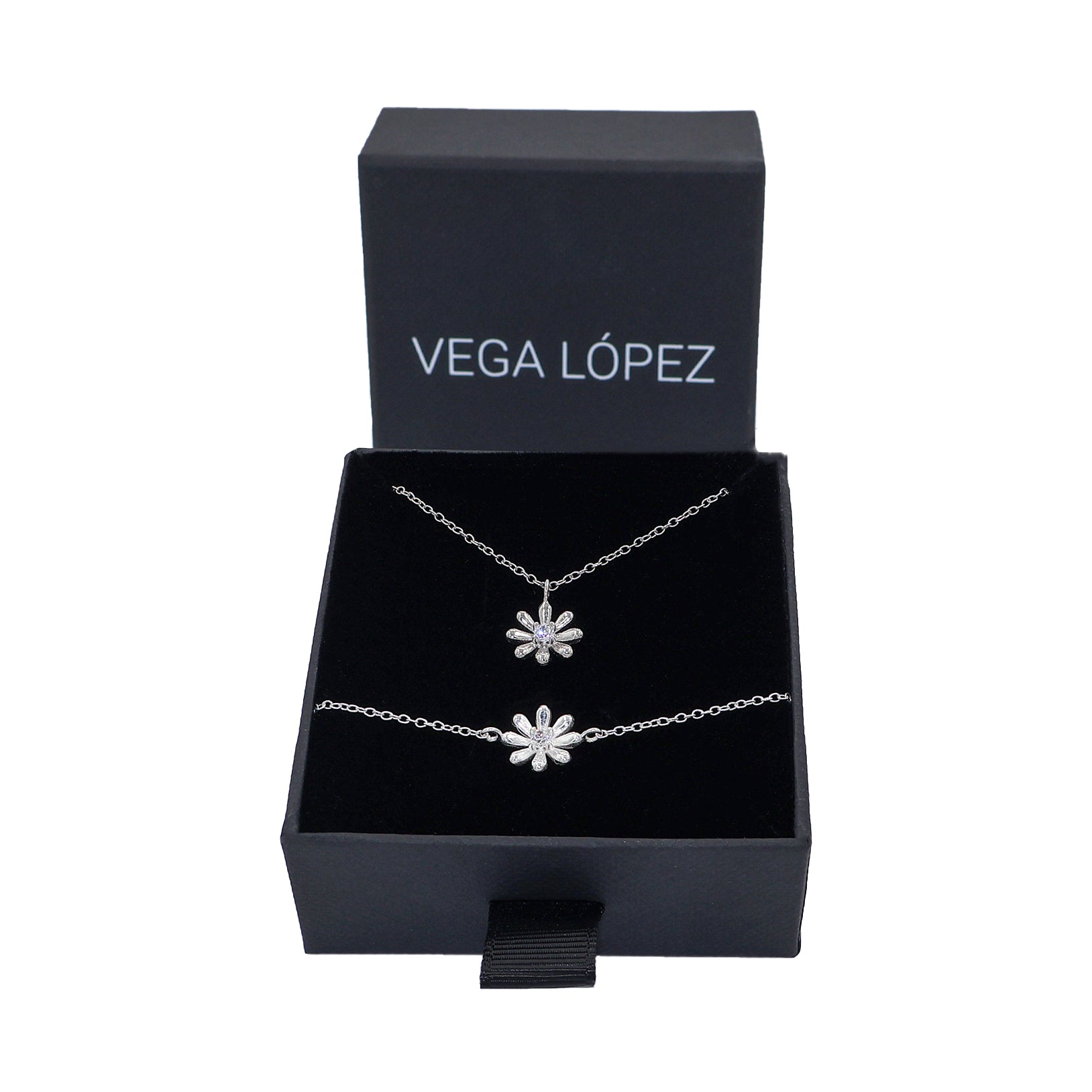 The matching bracelet is plated entirely with 999 silver and includes a similar floral charm, creating a harmonious and elegant look when worn together with the necklace.