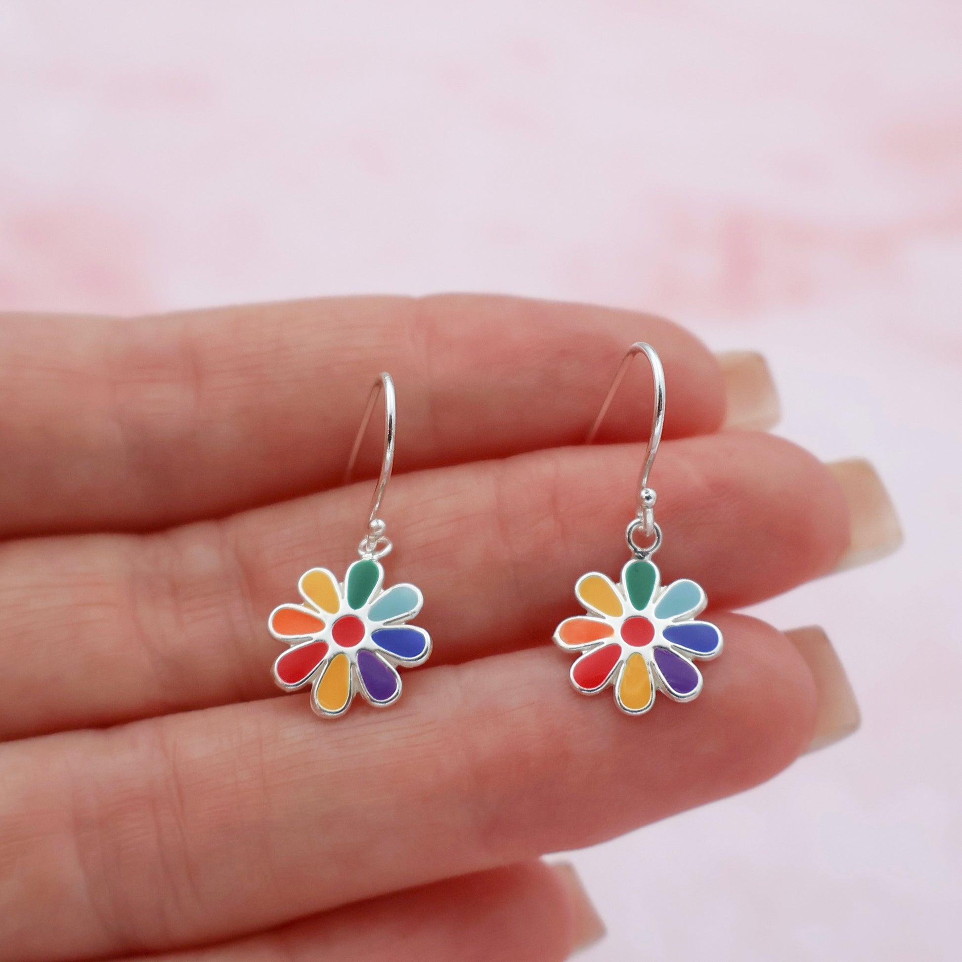 The matching earrings each feature a similar multicolored flower, bringing a playful elegance to the set and adding a pop of color around the face.