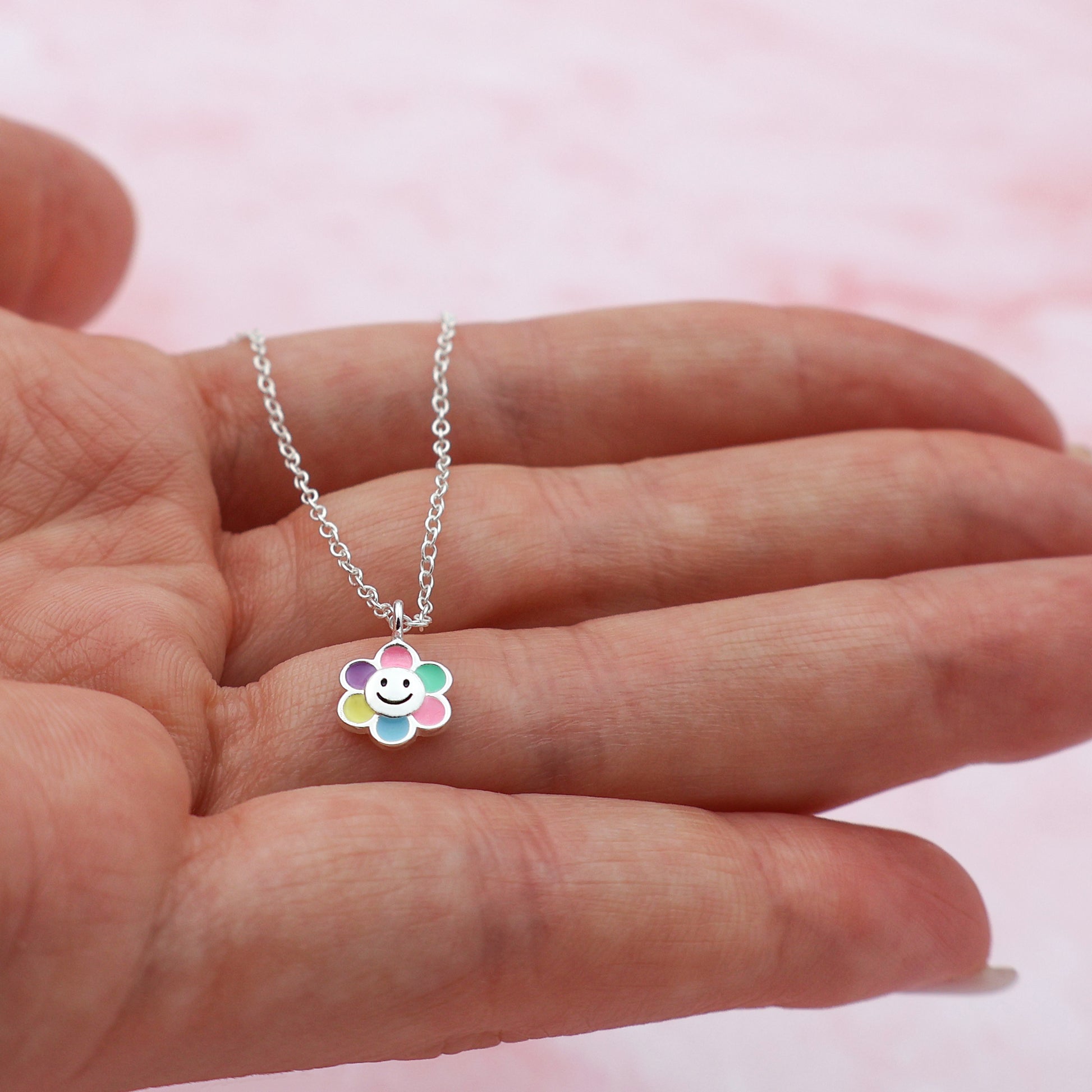 El colgante tiene una forma alegre y creativa: en el centro, una sonrisa estilizada irradia energía positiva, rodeada de pétalos multicolores. Cada pétalo está delicadamente teñido en tonos vibrantes, que contrastan maravillosamente con el brillo de la plata.