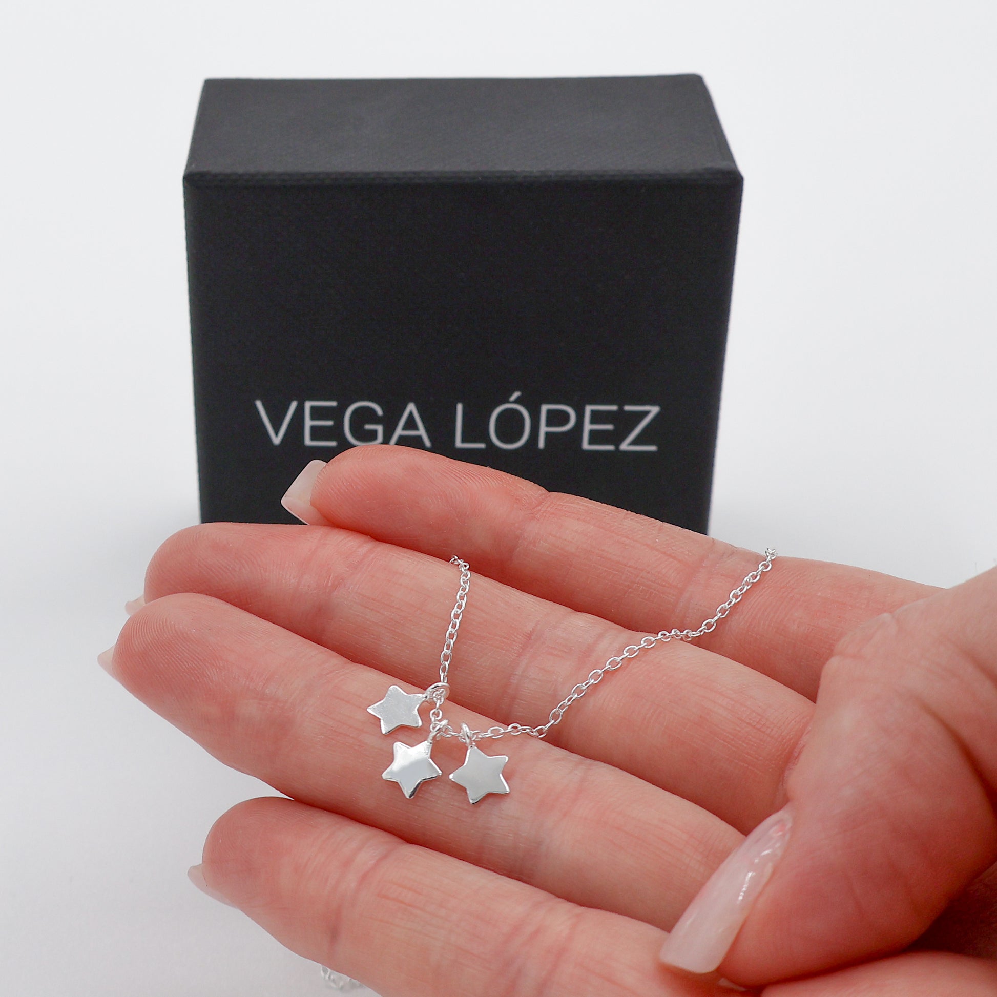 El diseño minimalista de las tres estrellas añade un toque de elegancia y fantasía, convirtiendo a este collar en un accesorio perfecto tanto para el día a día como para ocasiones especiales. Su estilo elegante y moderno es versátil y simboliza una belleza celestial que resiste el paso del tiempo.