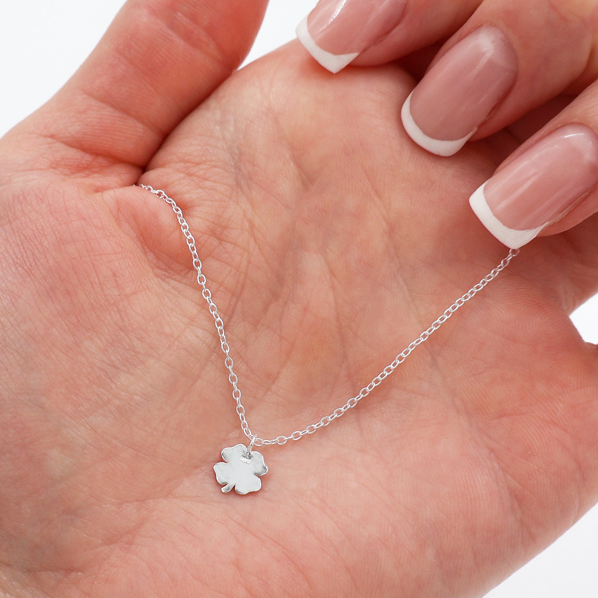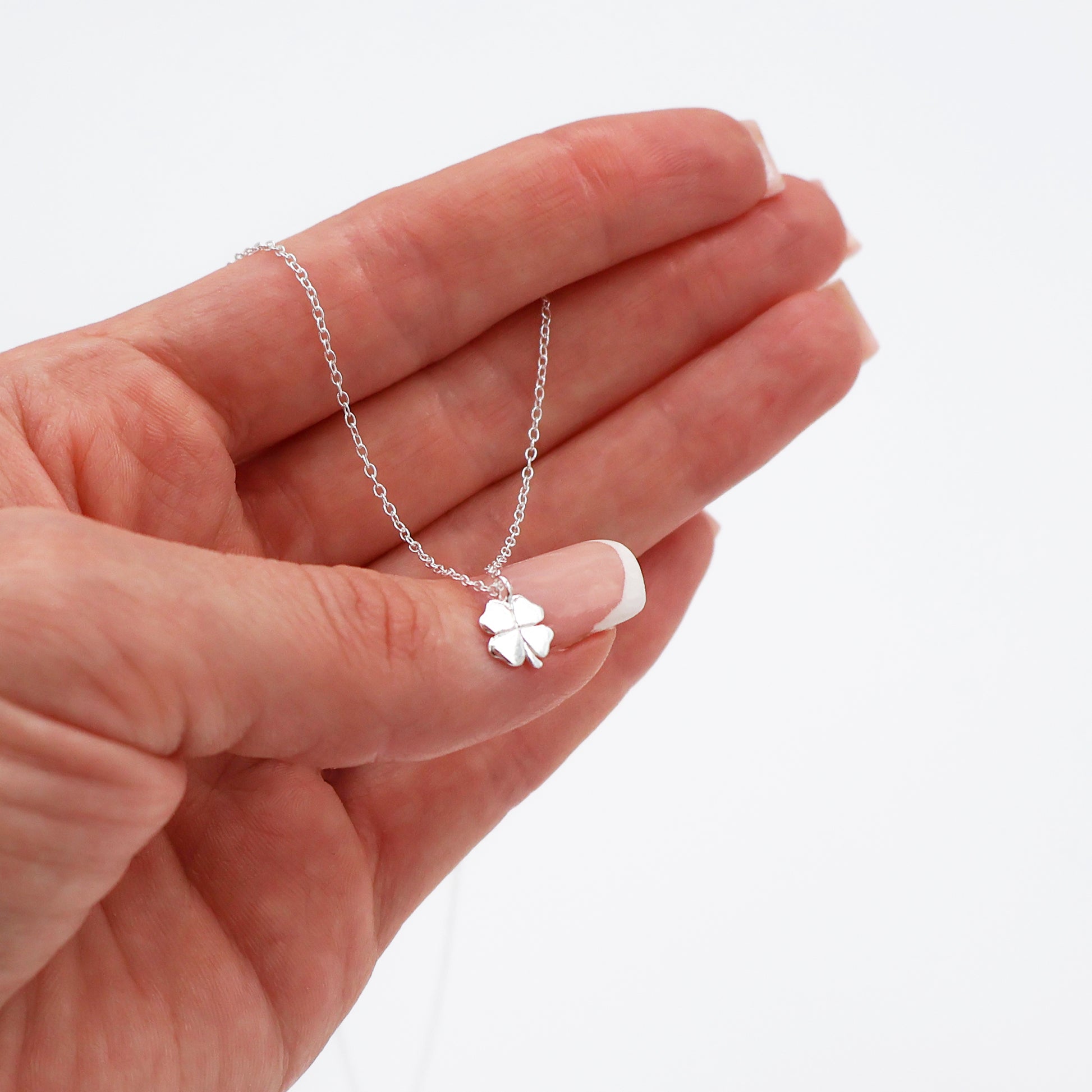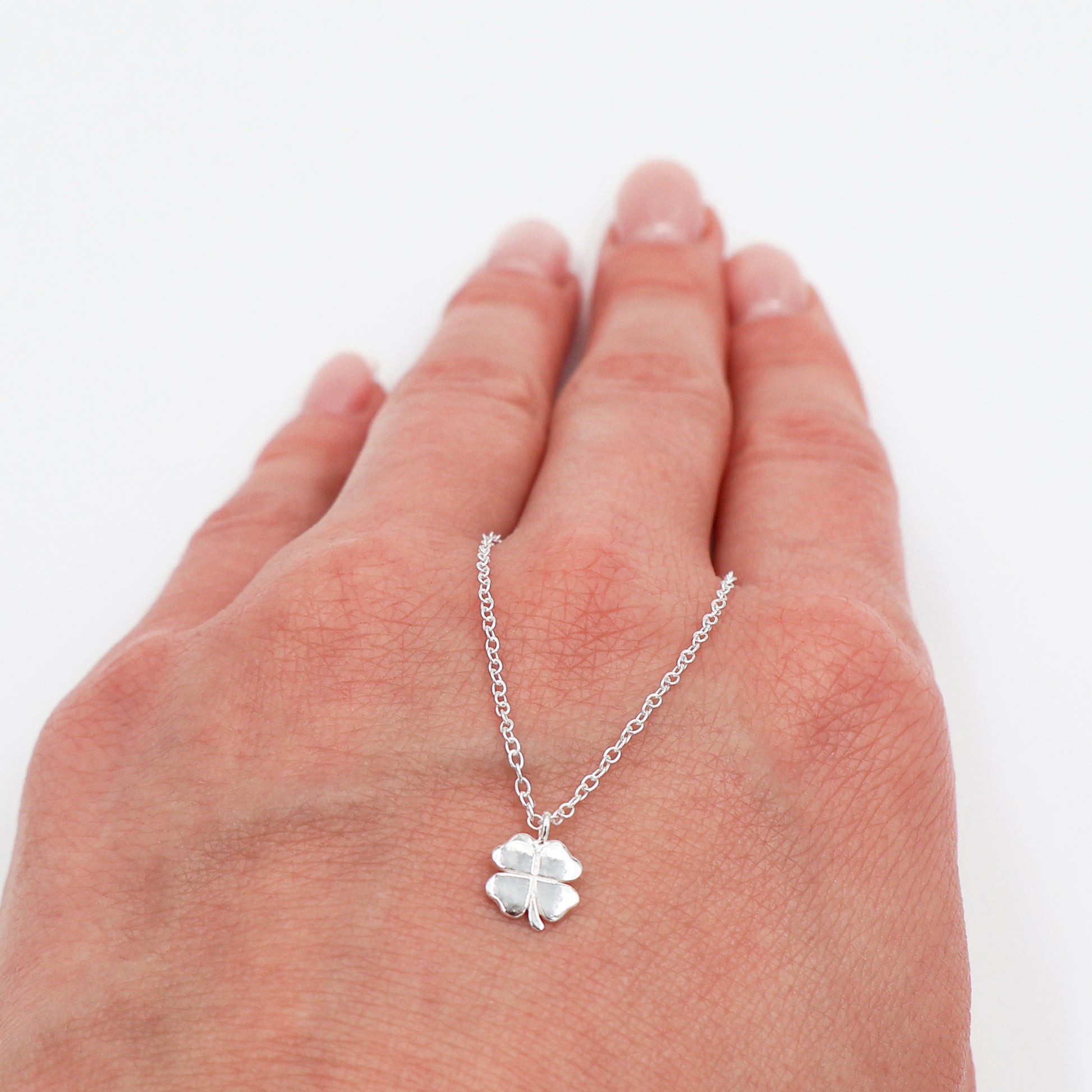 El colgante de trébol de cuatro hojas simboliza la suerte y el encanto, complementando la elegancia de la fina artesanía en plata.