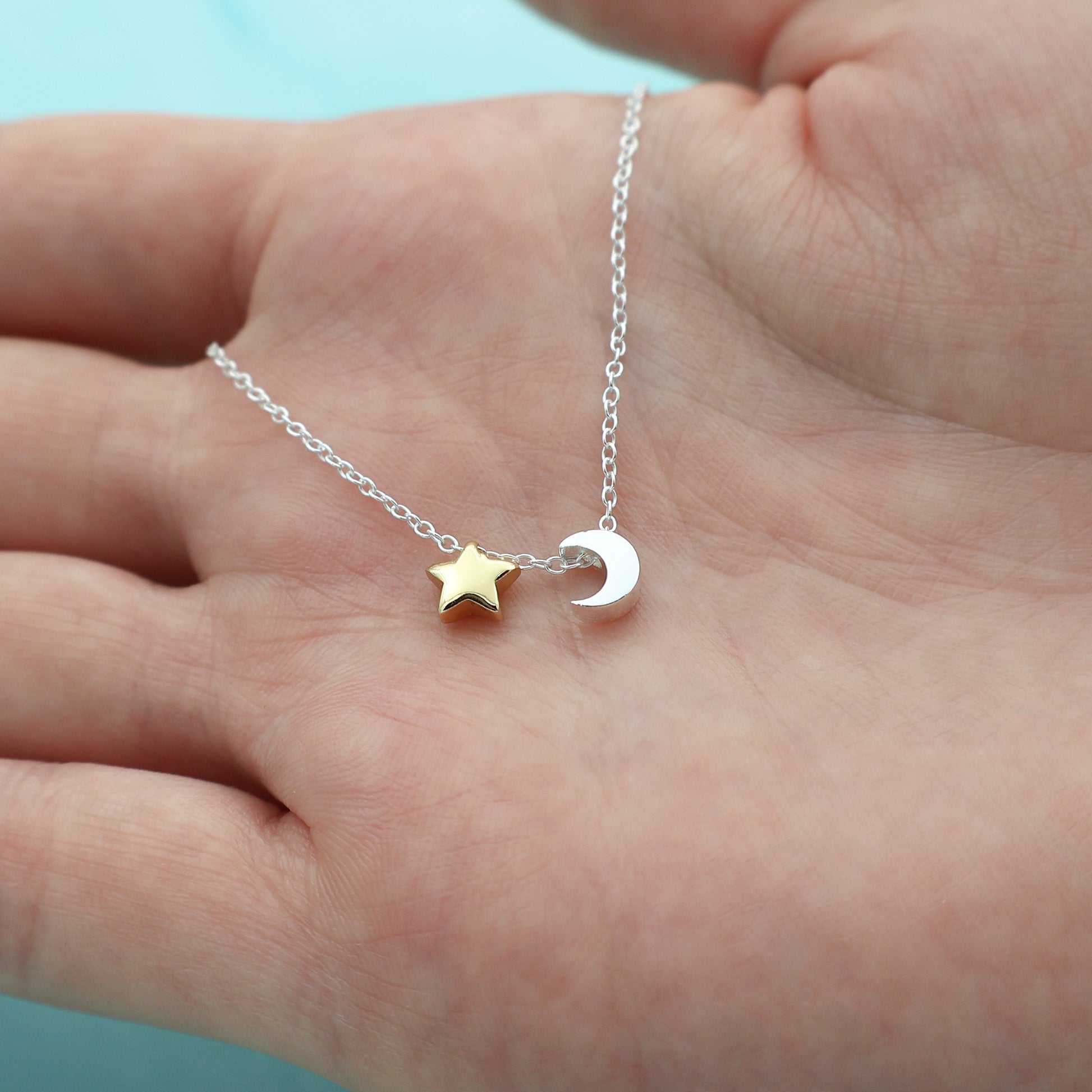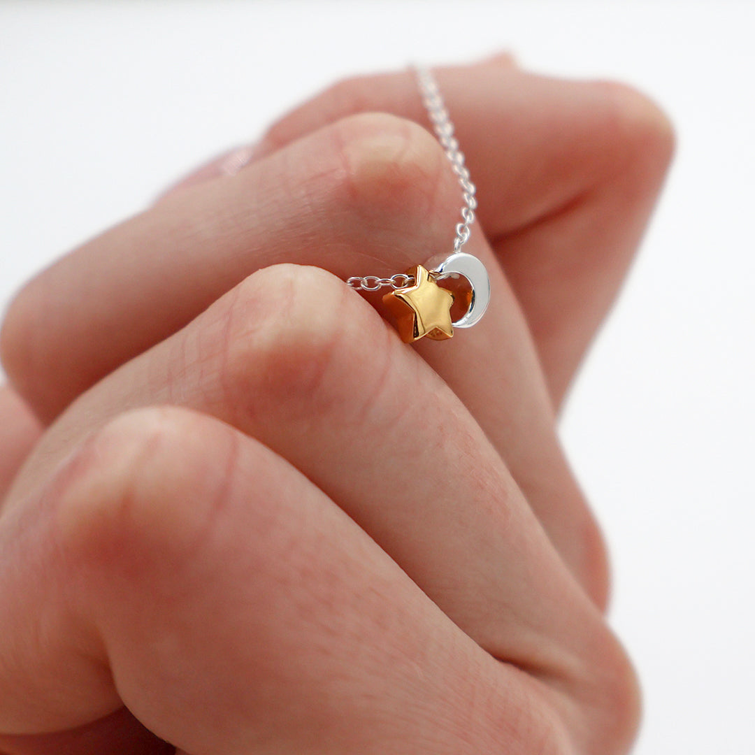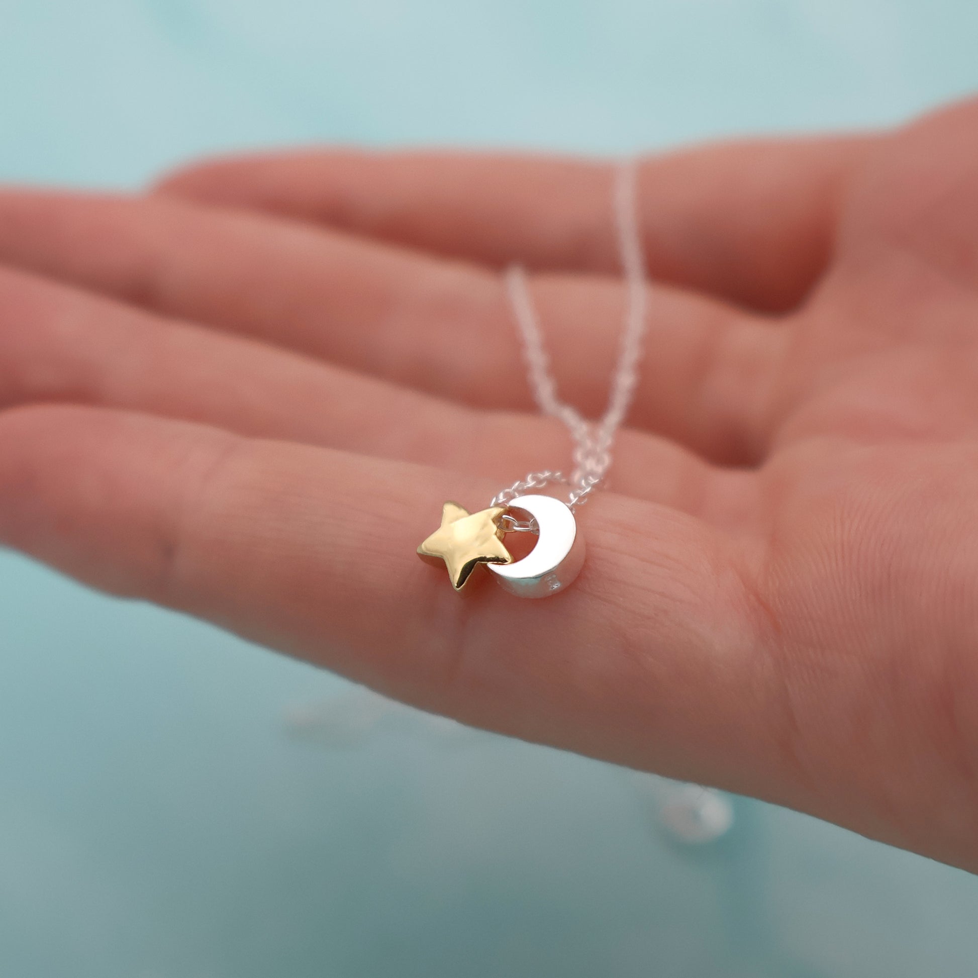 El collar presenta dos delicados colgantes: uno en forma de luna, en un tono plateado radiante, y una estrella dorada, terminada con tecnología e-coat que agrega un sutil pigmento dorado y protección extra.