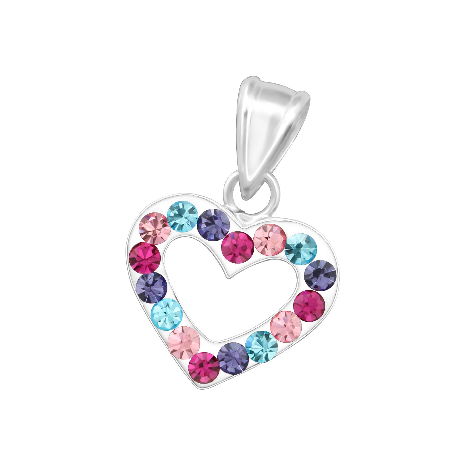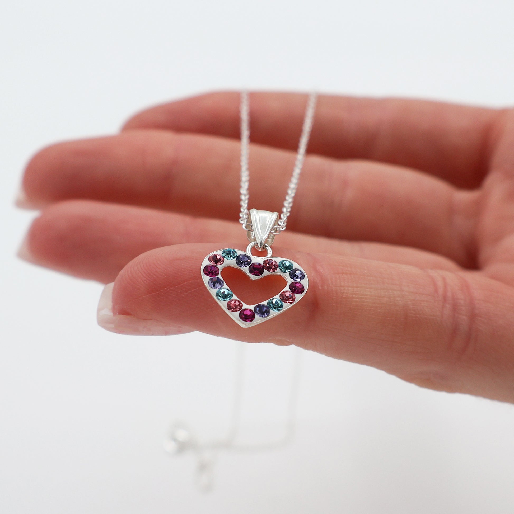 Sterling Silver 925 Heart Pendant Necklace with 16 Colorful Zirconia