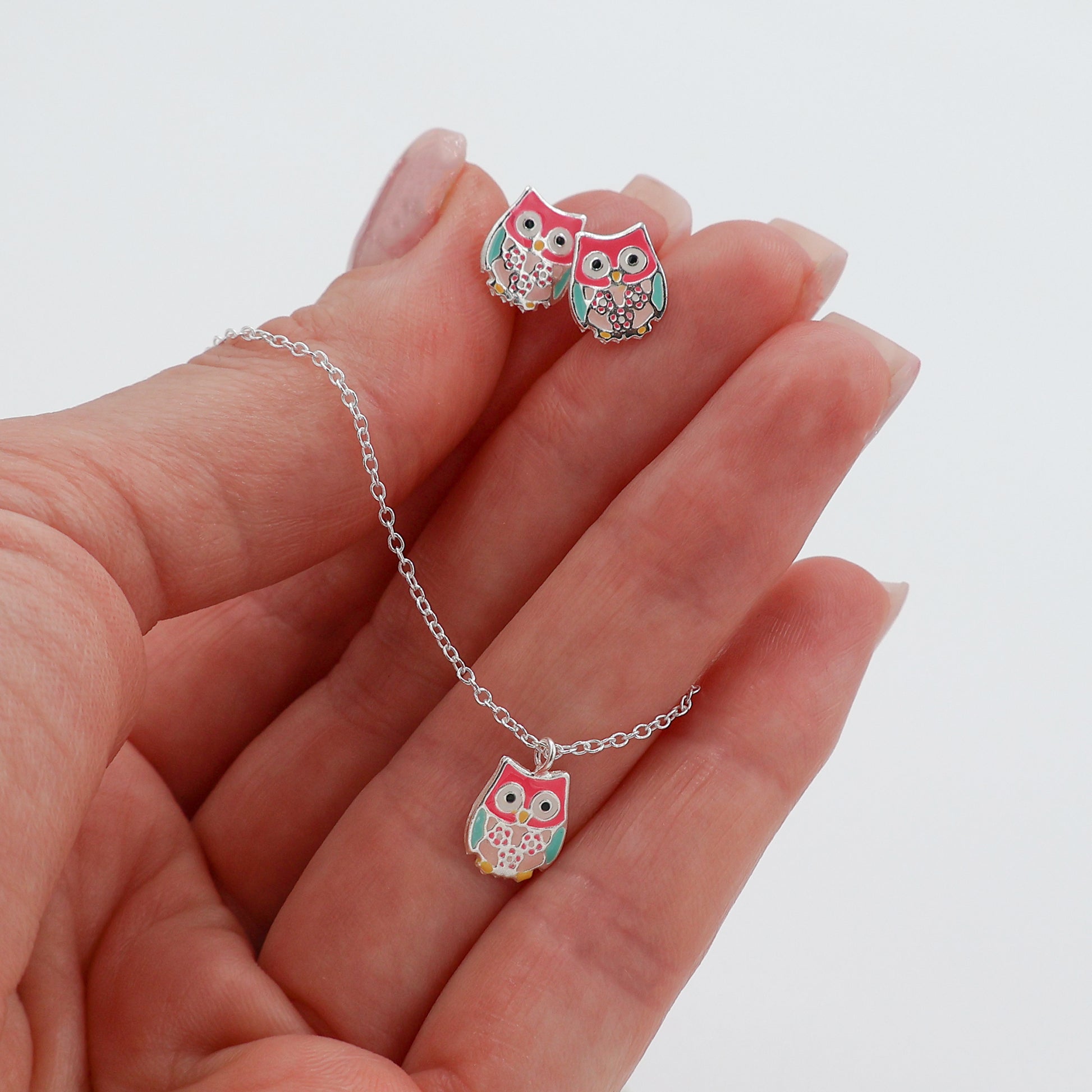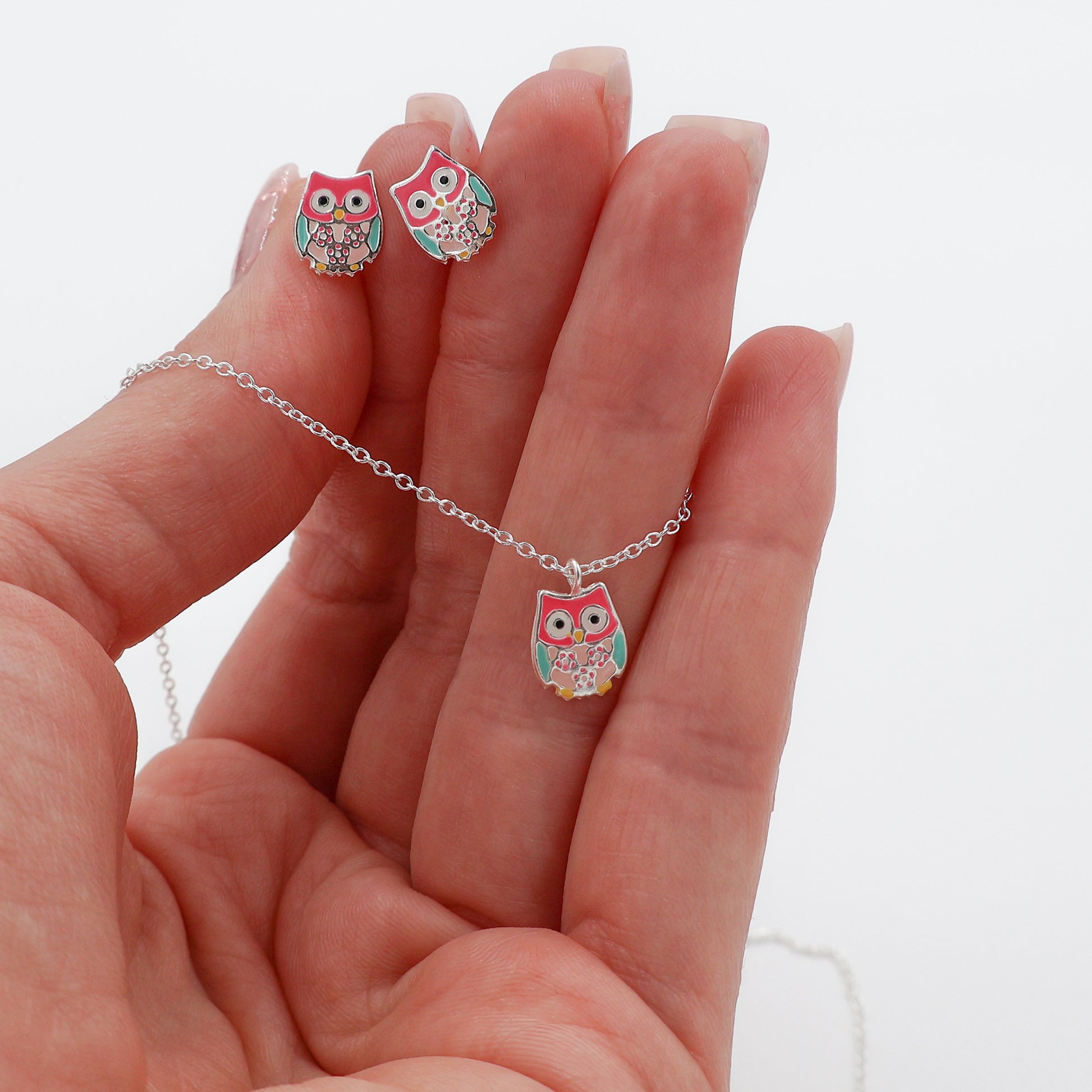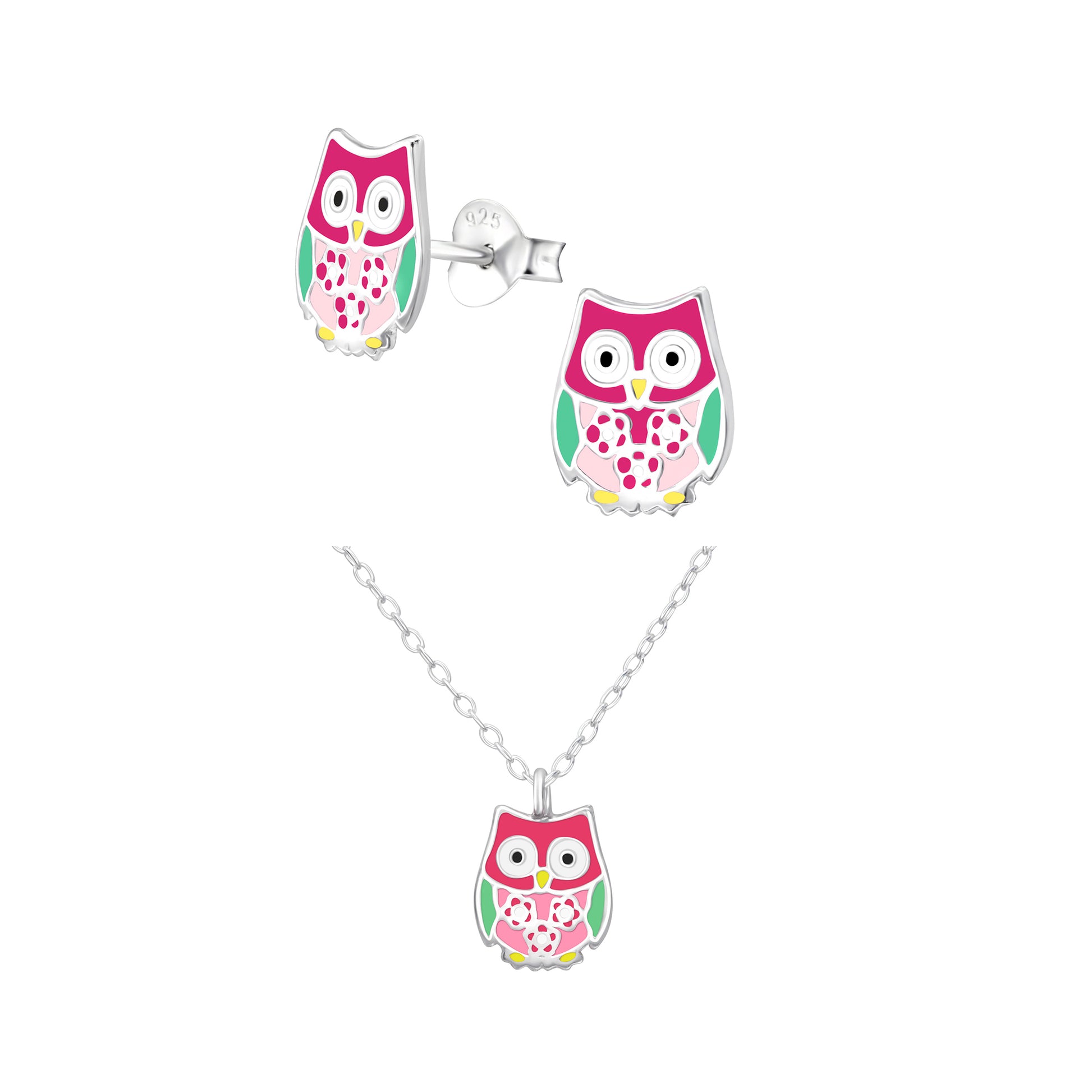 Sterling Silver Jewelry Set for Kids – Necklace and Earrings, Multicolored Owl