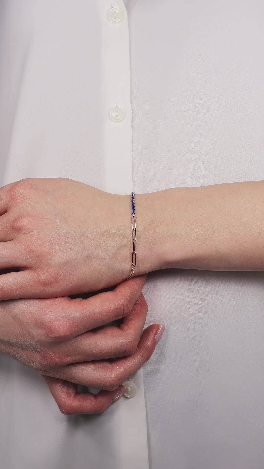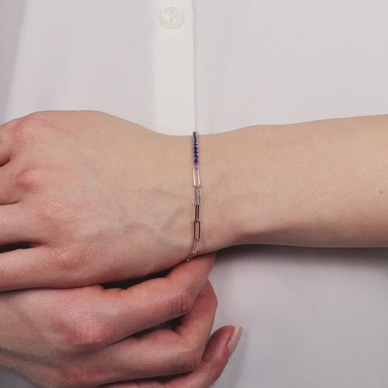 One half of the bracelet features a sleek tennis setting adorned with sapphire-colored zirconia stones, delivering a refined sparkle and rich depth of color. The other half is composed of polished elongated silver links, creating a modern contrast that elevates the traditional tennis bracelet silhouette.