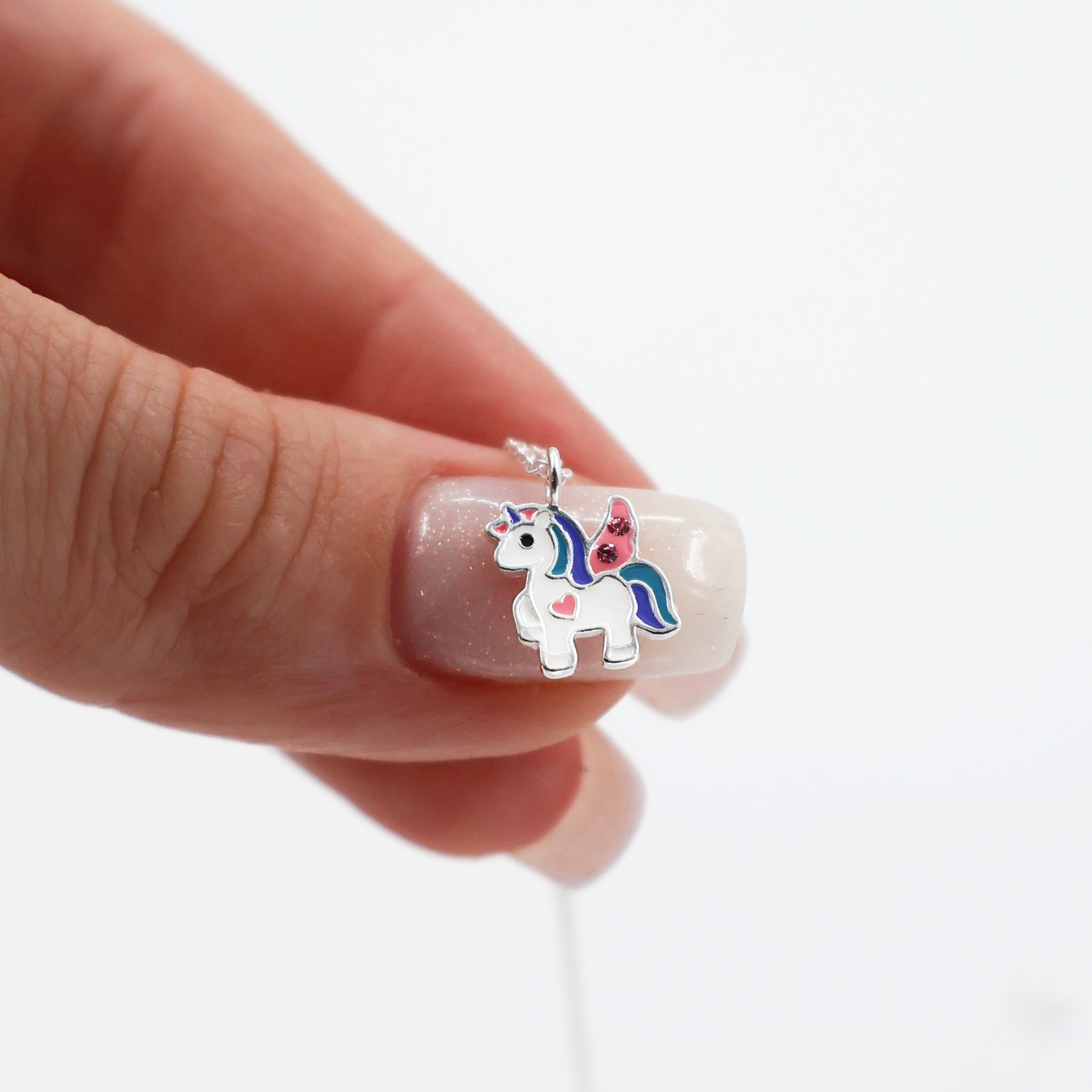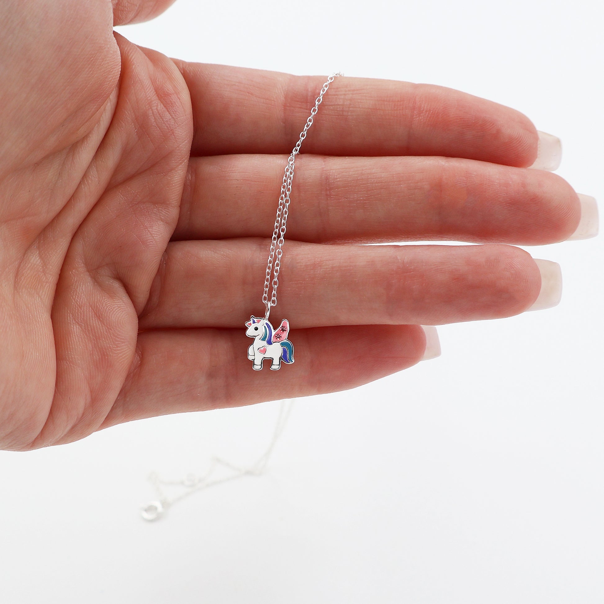 A charming necklace featuring a delicate unicorn pendant, crafted from 925 silver and adorned with white epoxy resin and soft pink wings.