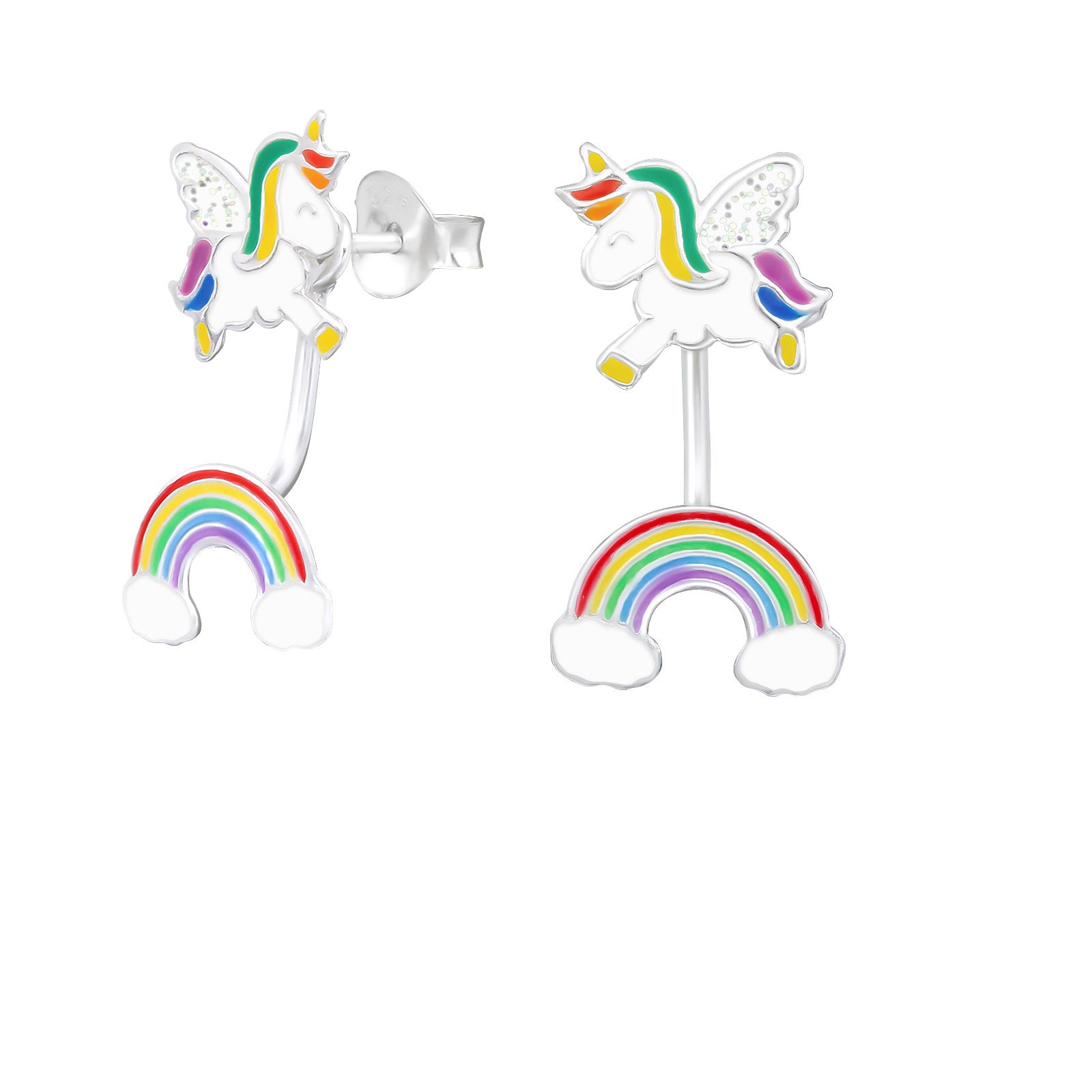 El elemento central es un unicornio caprichoso combinado con un arcoíris colgante, creando una apariencia mágica y divertida.