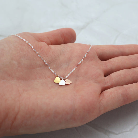 Colier argint 925 pentru femei - 3 pandantive inimioare, argintiu, auriu și bronz