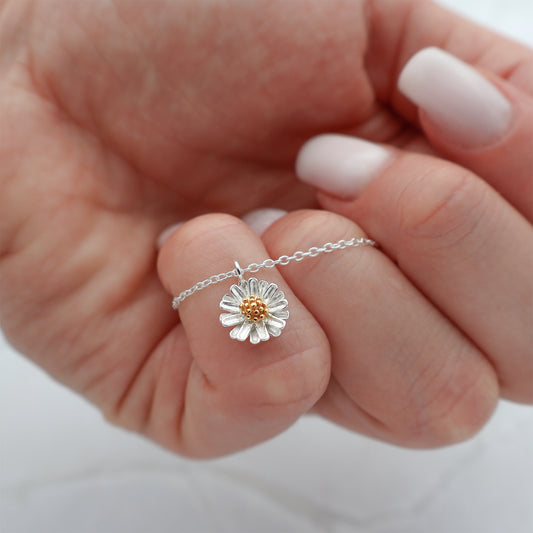 Colier din argint de damă cu margaretă delicată și pistil auriu
