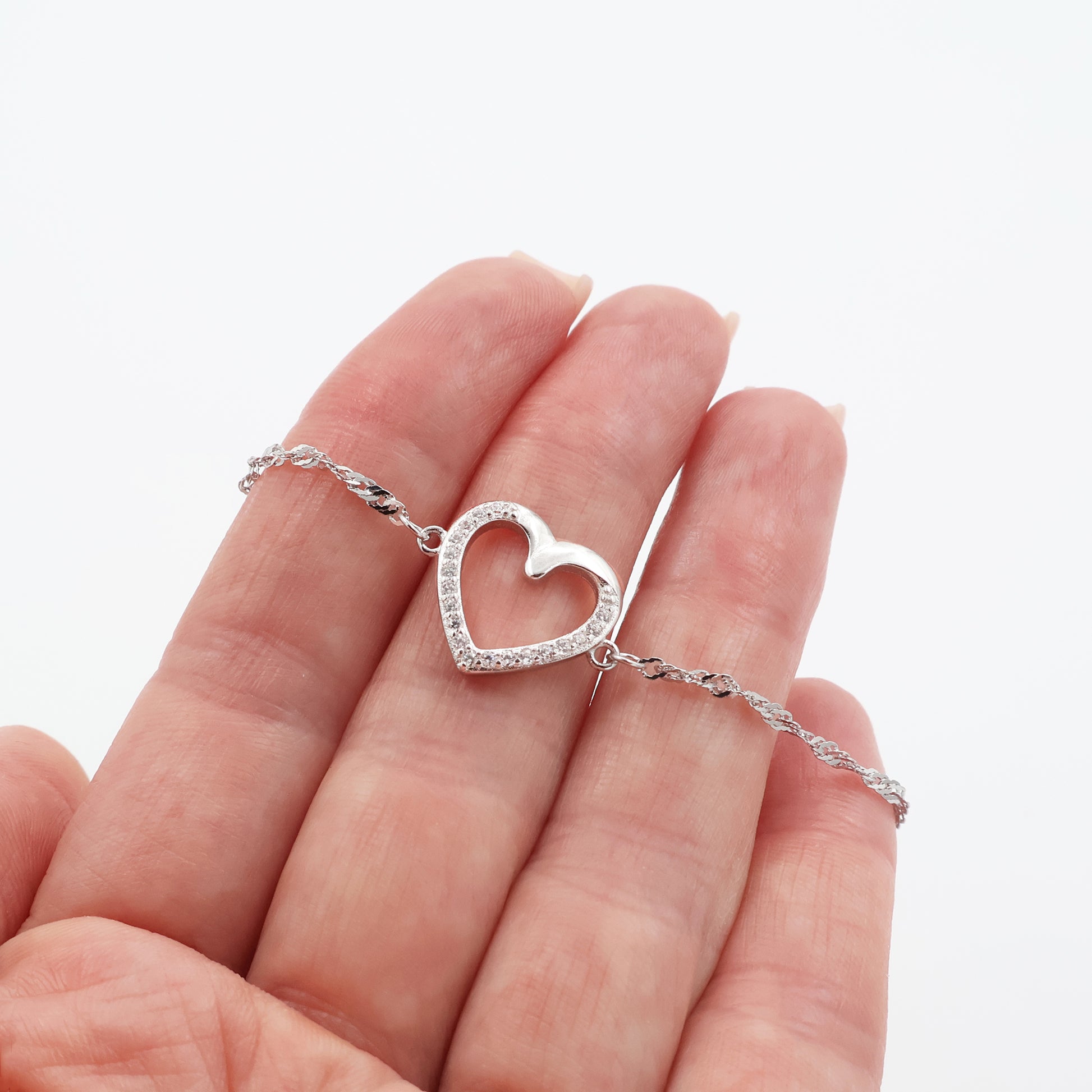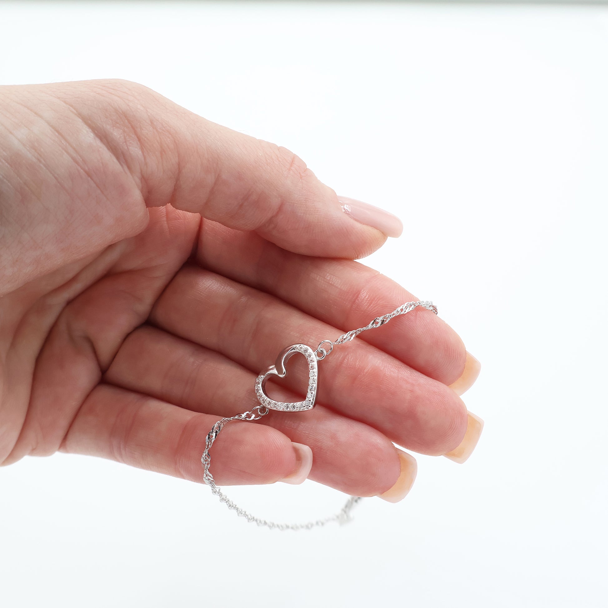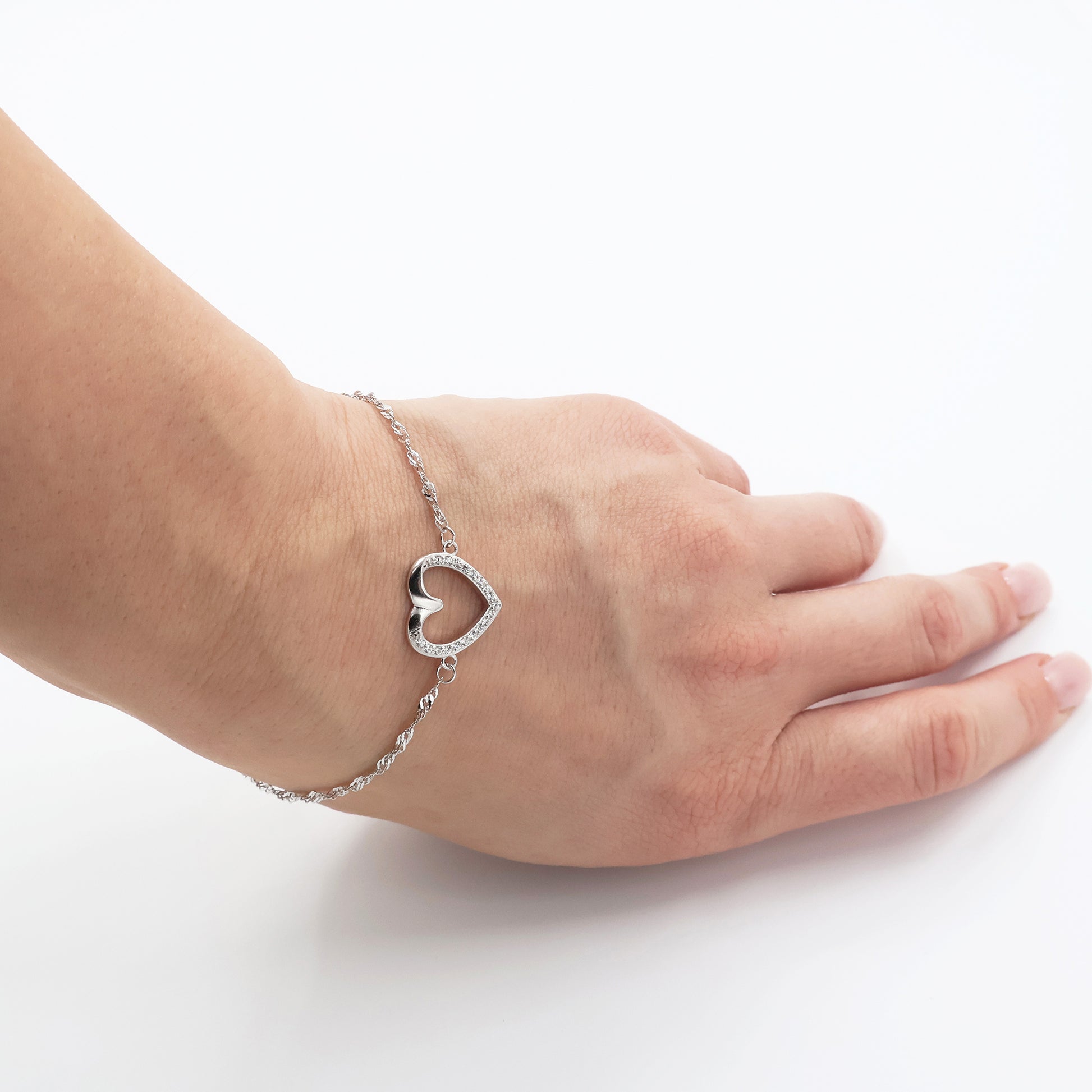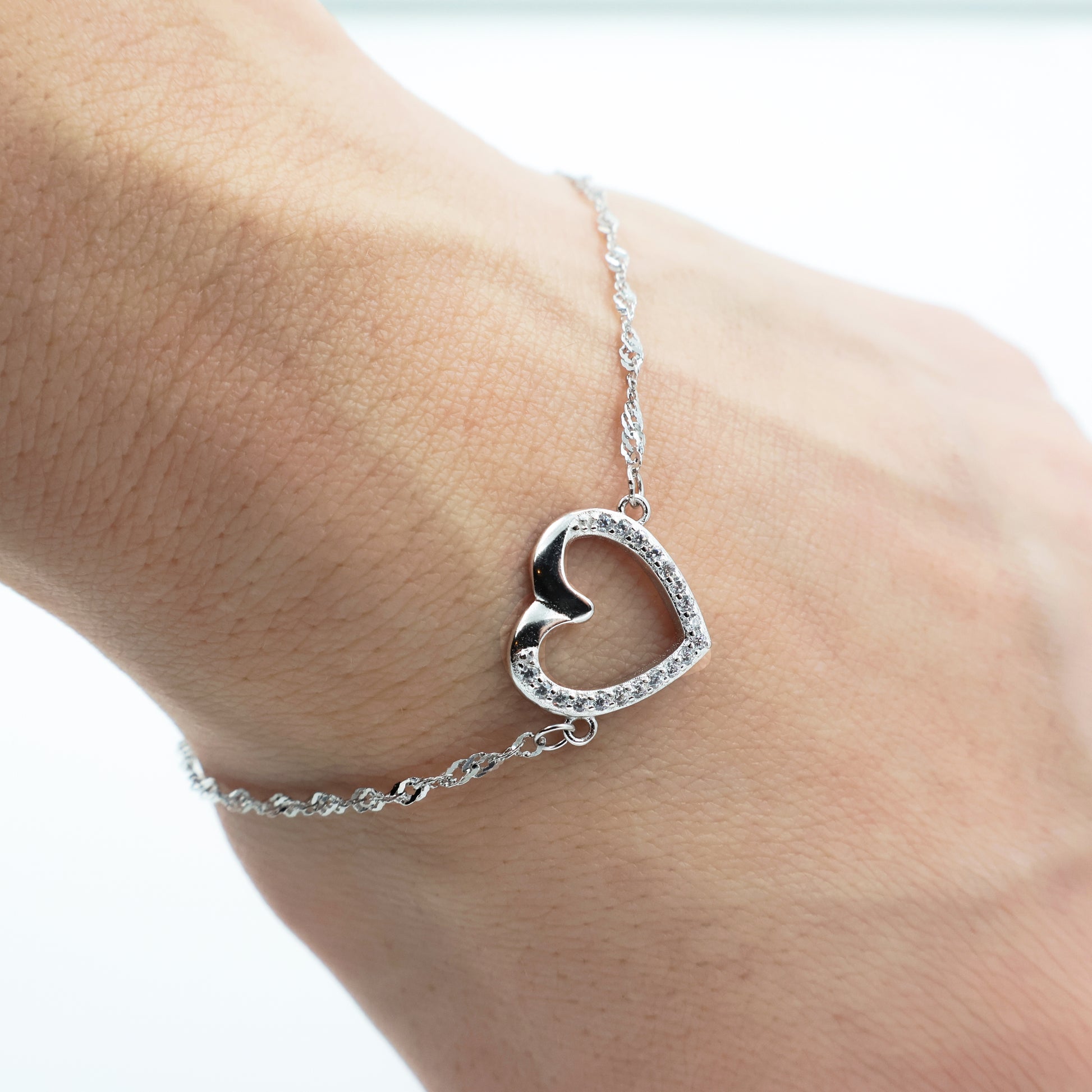 Această brățară delicată evidențiază frumusețea rafinată a unui lanț de tip Singapore, îmbinat cu farmecul elegant al unui motiv în formă de inimă. Realizată din argint 925 placat cu rodiu, oferă o strălucire intensă și o rezistență de încredere împotriva oxidării.