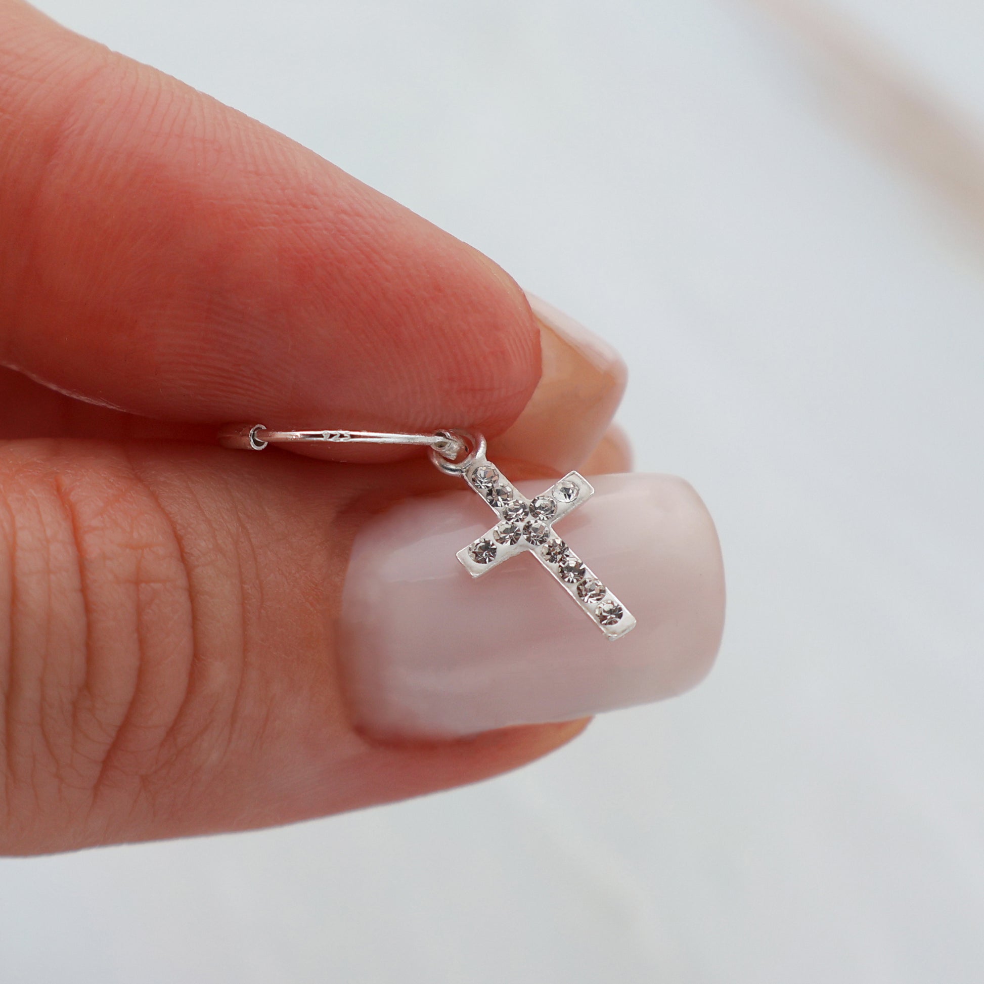 Cercei din argint pentru femei – creole cu cruciuliță și cristale