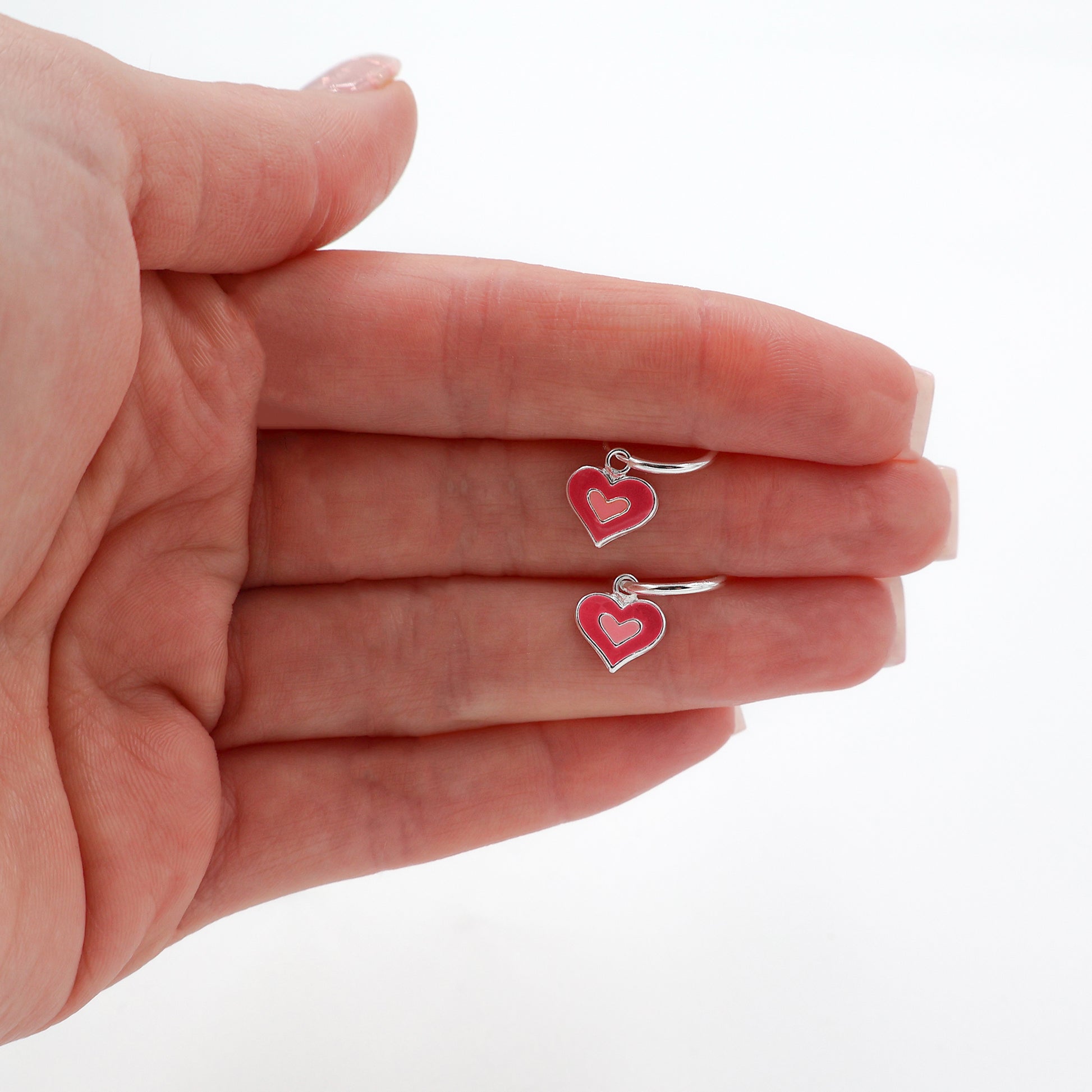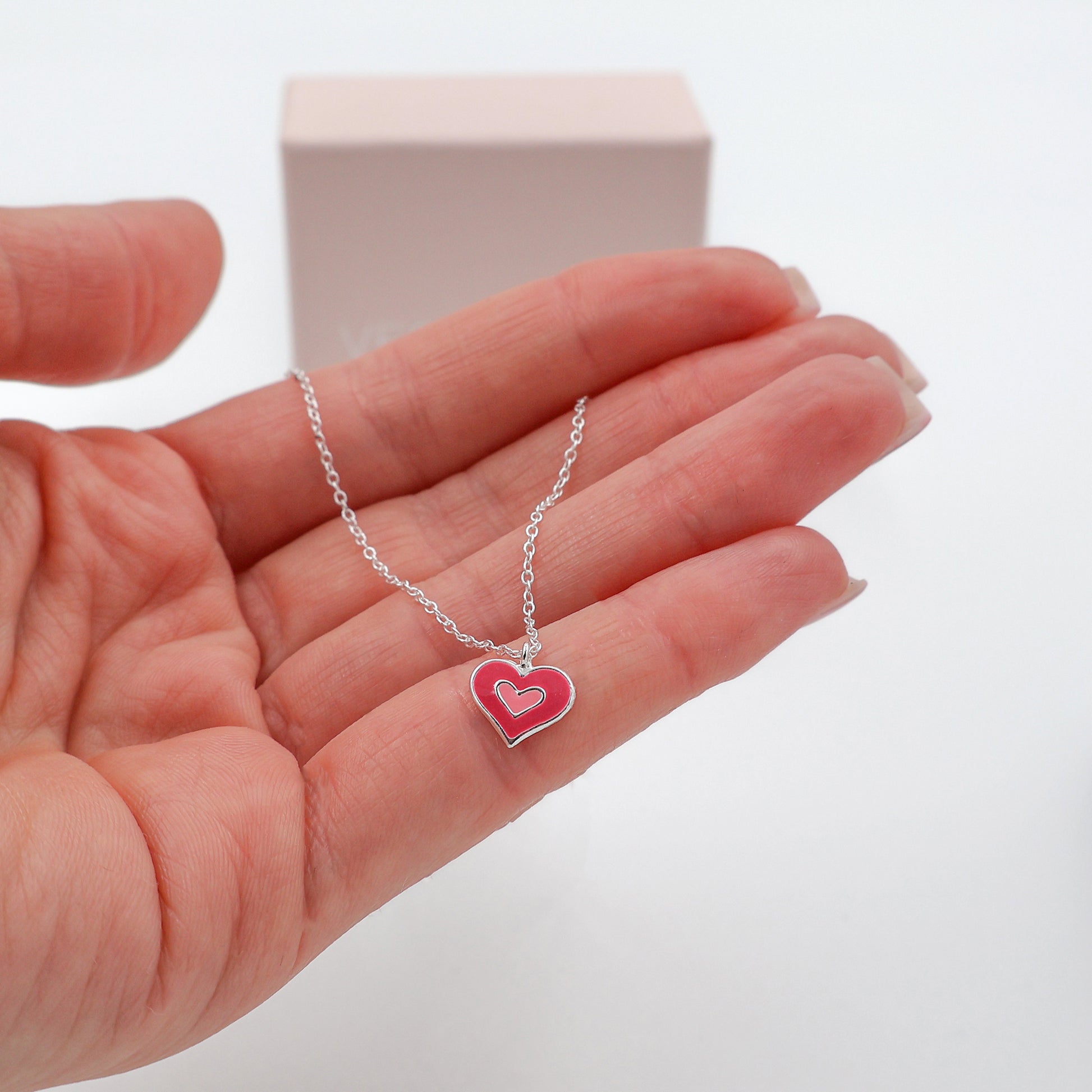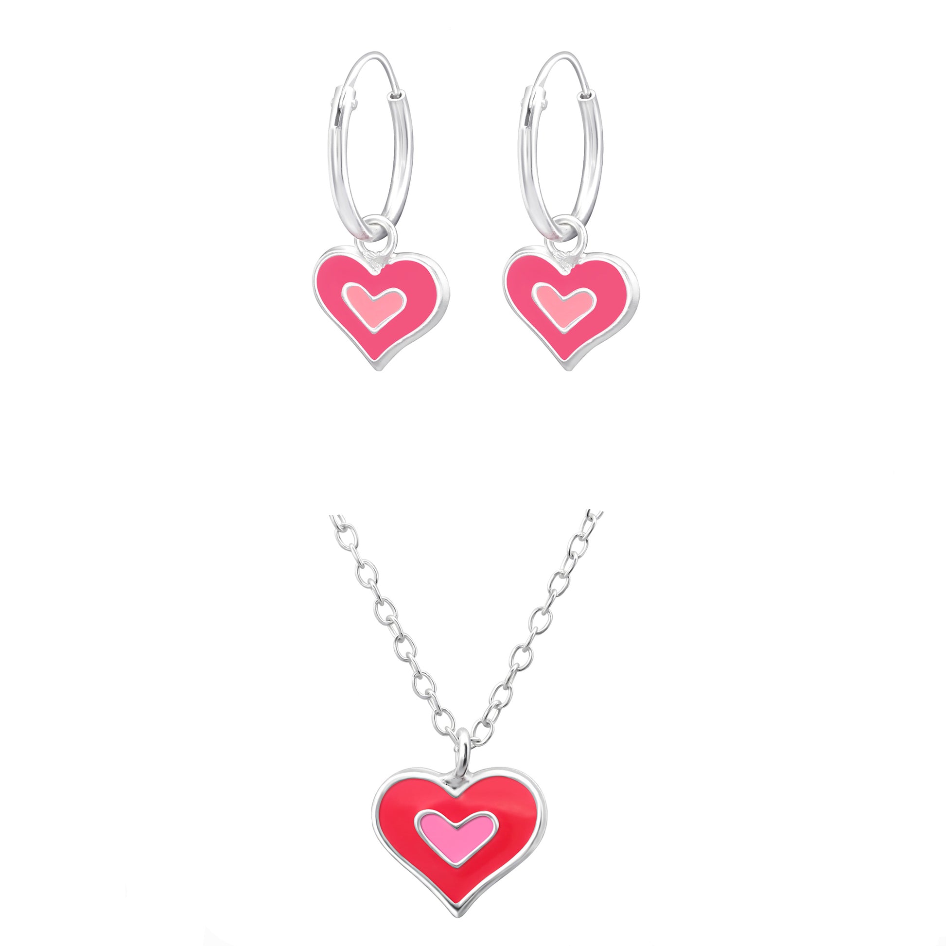 Acest set fermecător din argint 925 include un colier și cercei, ambele cu un design jucăuș de inimioare colorate din rășină epoxidică. Inimioara mică roz este elegant înfășurată într-o inimioară mai mare roz intens, creând o combinație vibrantă și veselă, perfectă pentru a adăuga un strop de culoare în ținutele celor mici.